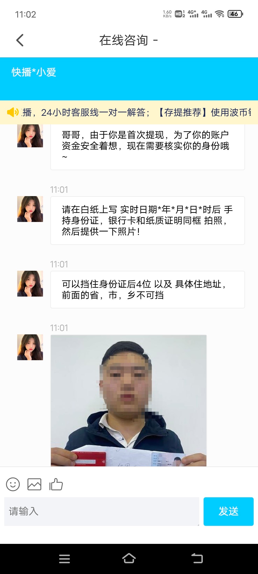 前几天也是回访提款100让我录手持身份证加银行卡,配上纸条写时间还有仅供快播使用等字样,直接去输掉了