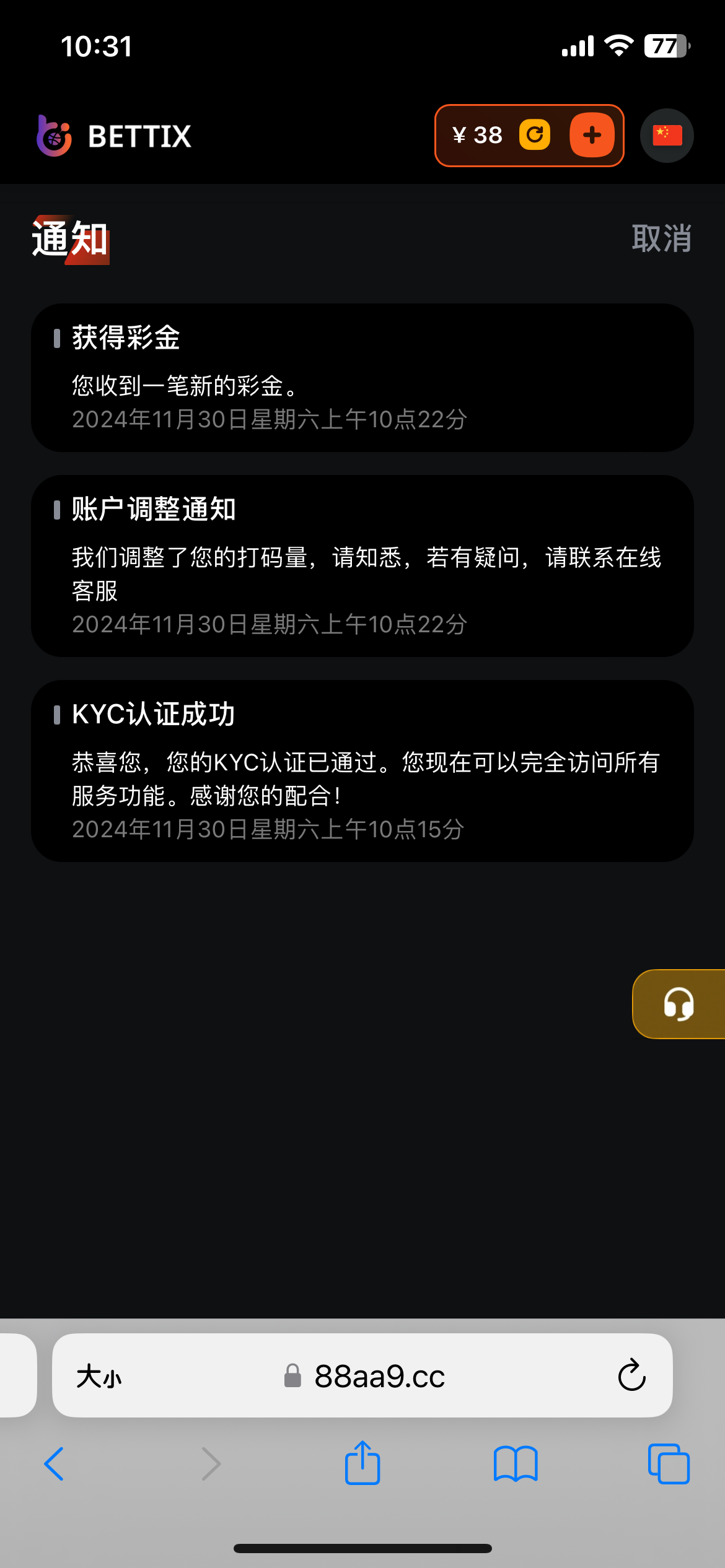 上次充值才可以领 没充值今天又可以领了 客服活过来了 认证送38 地址 88aa9.cc