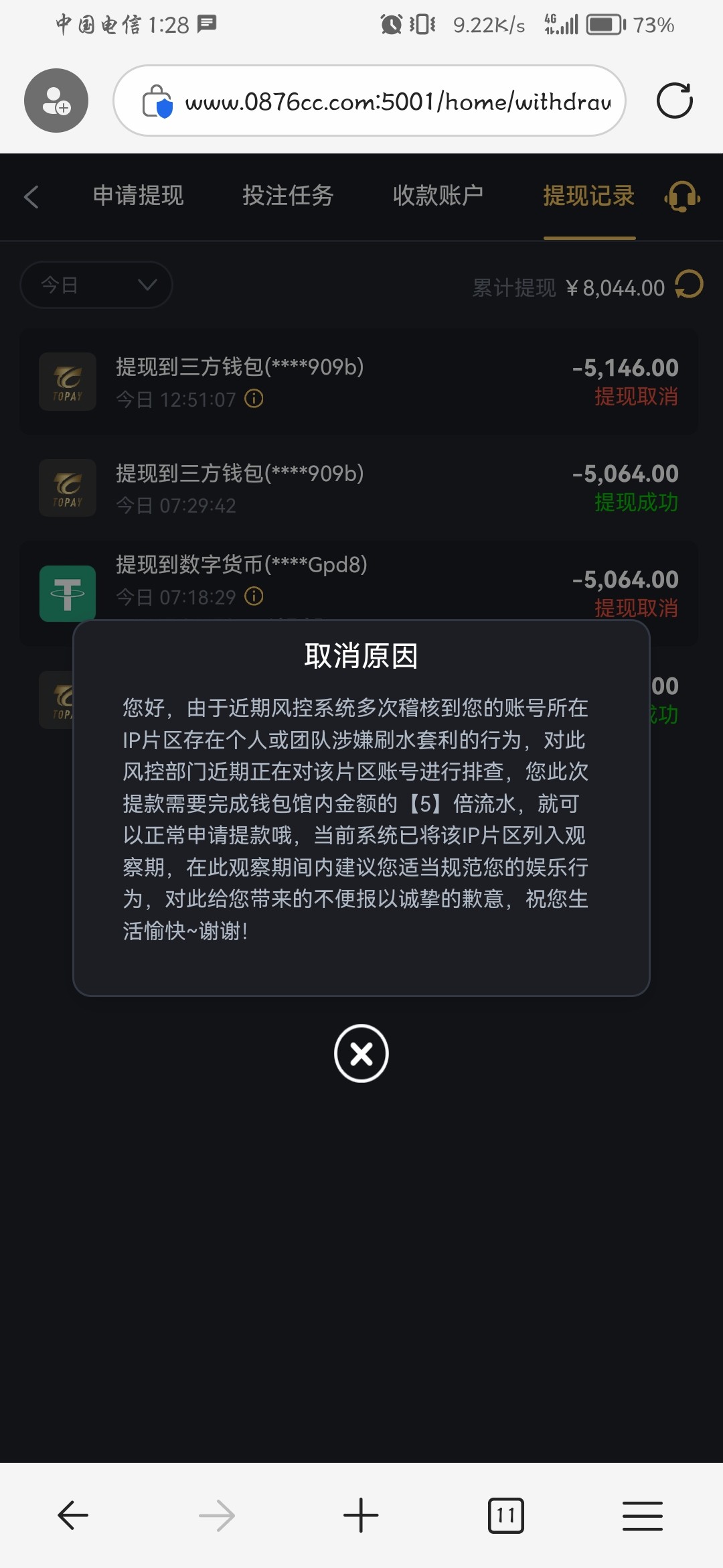 第一次充值3500提5000说我IP片区异常让我打五倍流水,最后打出来提了7300给了,第二次充值4000去打电子输了3000左右然后去真人玩提10000说网络波动注定没更新退回让我继续打一倍流水而且只能电子还把我所有优惠还有反水包括VIP等级那些都封了(有一千多优惠彩金没领),我还是打够流水提了一万给了,只能说这逼台没格局的,幸好我不是一次性赢他一万多,要是一次性赢他这么多估计也是黑了,还有就是这逼台电子没水百分百控死的,我真人累计赢两万多,然后玩电子输了8000左右,拉麻将2拉了三万流水没进免费,你们不玩或不是老哥下级的注意点玩吧,别人老哥下级出事还能找老哥你们不是老哥下级只能认了然后气死自己