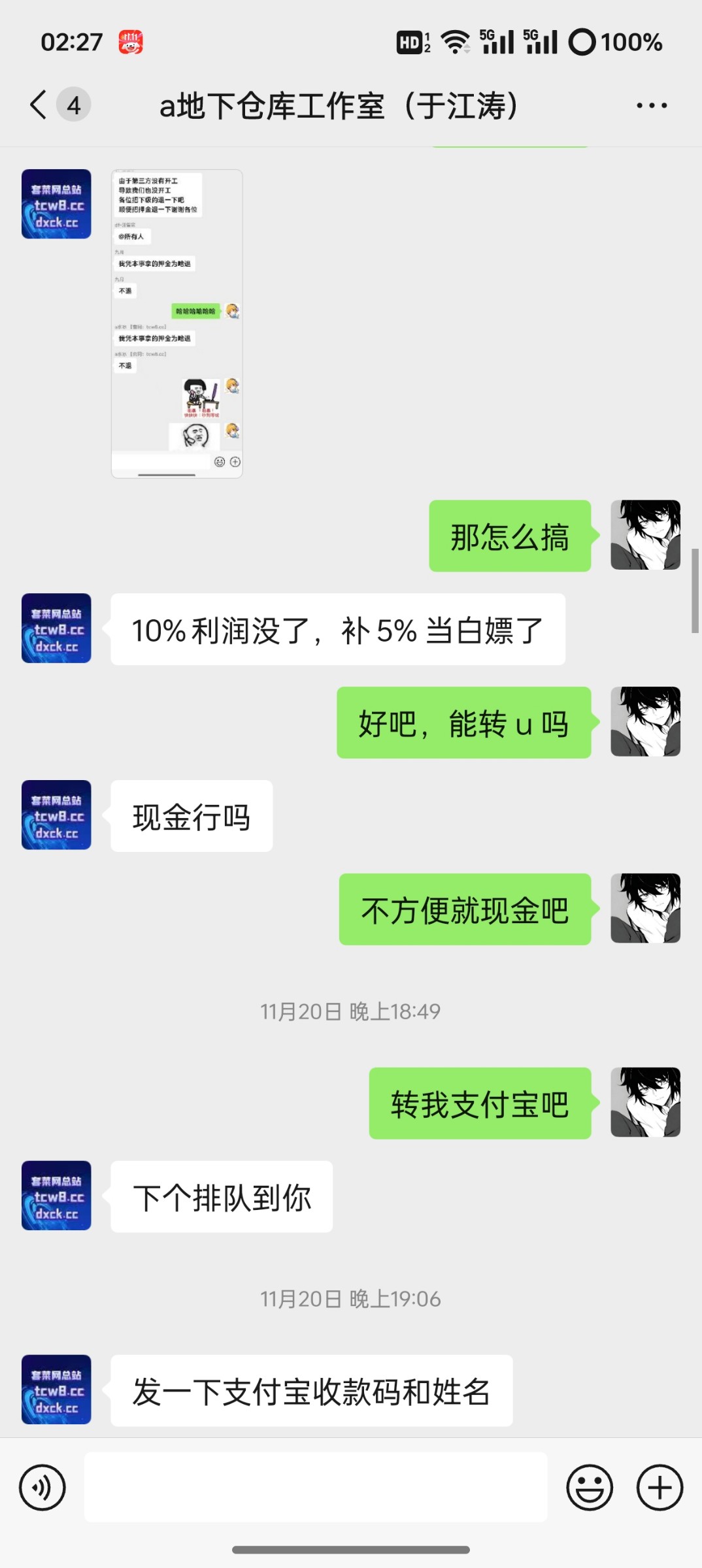给各位老哥们曝光一个跑路狗 地下仓库水冰 这个人还有开白菜网.一个跑路狗我真想笑.当时打电话给我说有项目.我也是直接打了1000u过去.现在过了 10 多天了还剩下4k多没给我.一直拖一直不给.微信不回旺旺不回.大家有这个人联系方式的或者认识的注意了.跑路狗