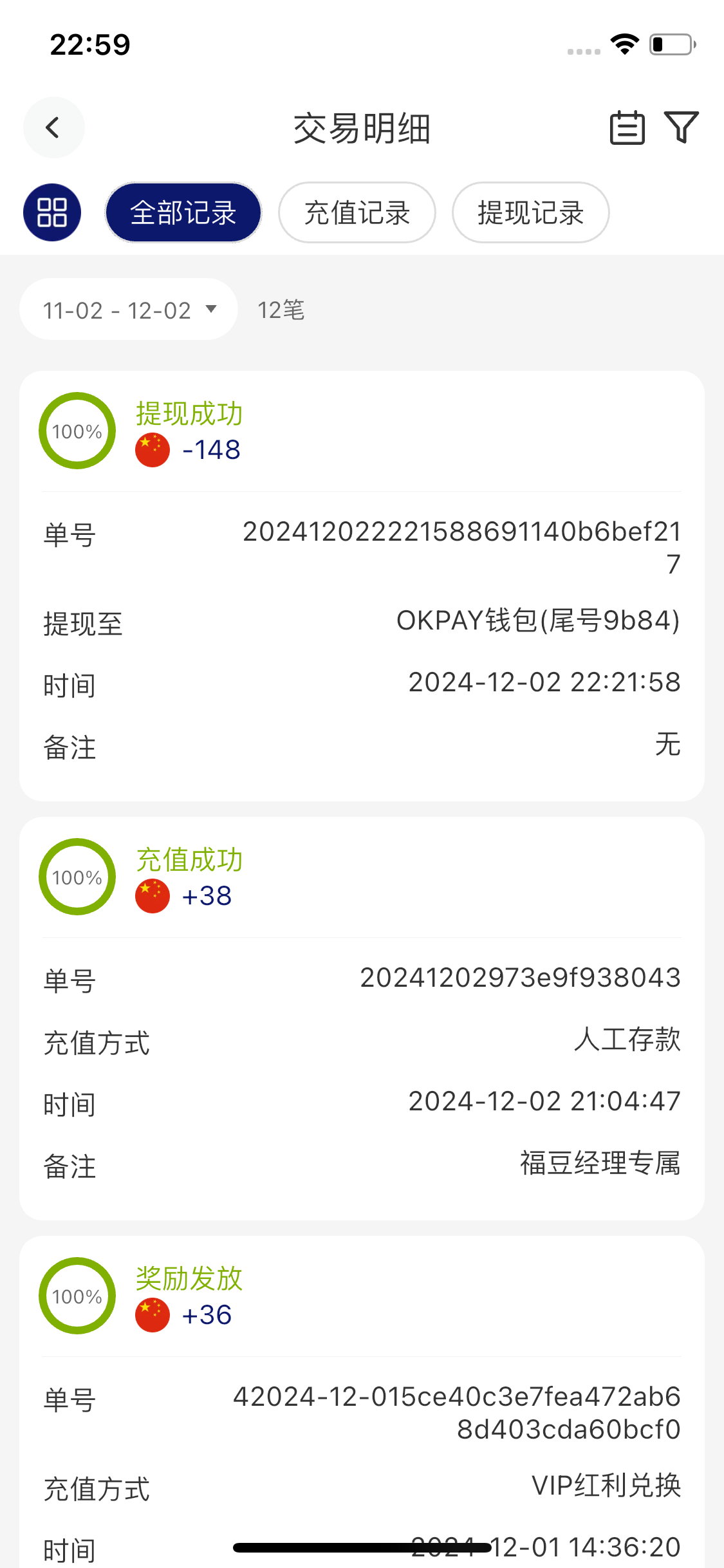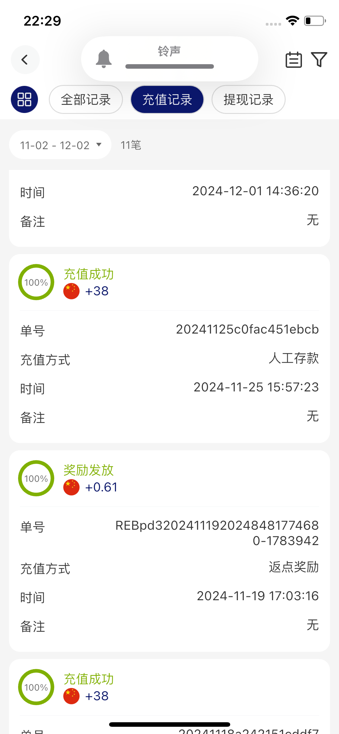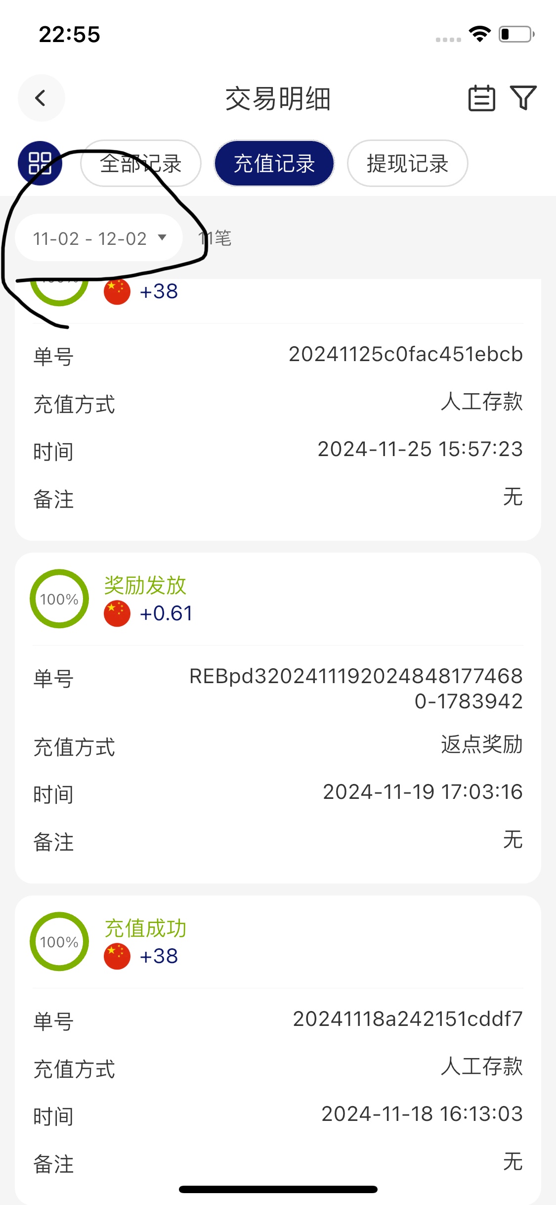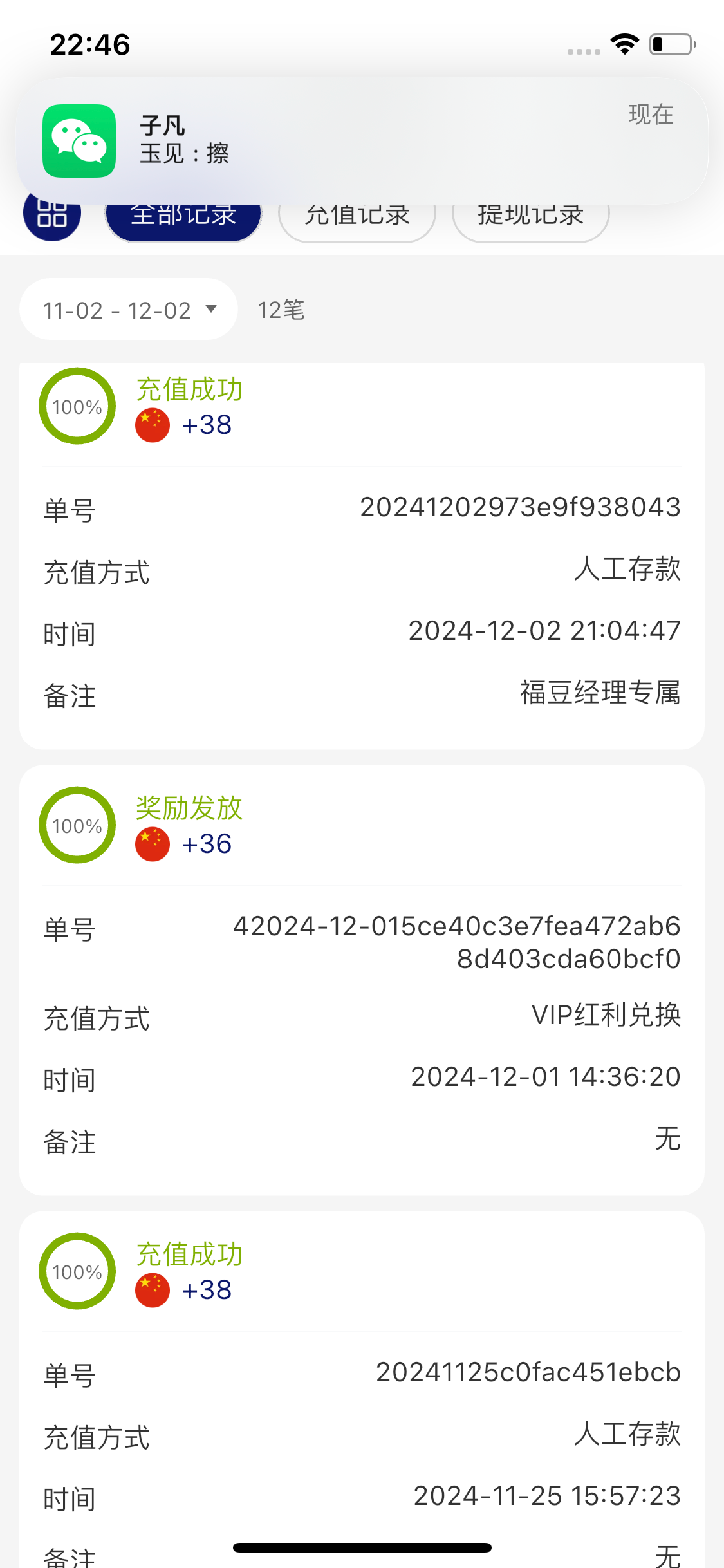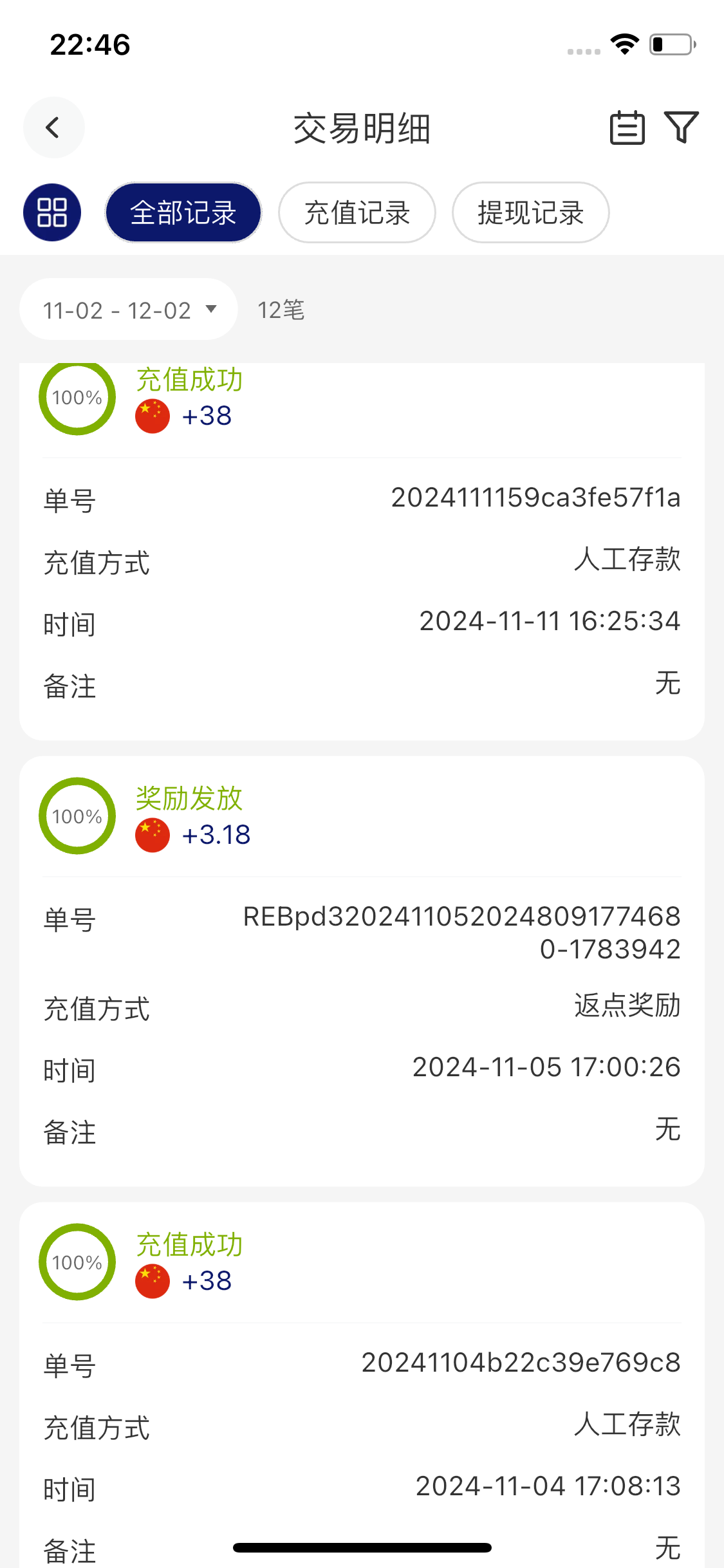 老哥可以看我11月到12月的充值记录,不是返点就是38,这个平台最低充值50,而且我也是v1都可以看到麻烦审核一下