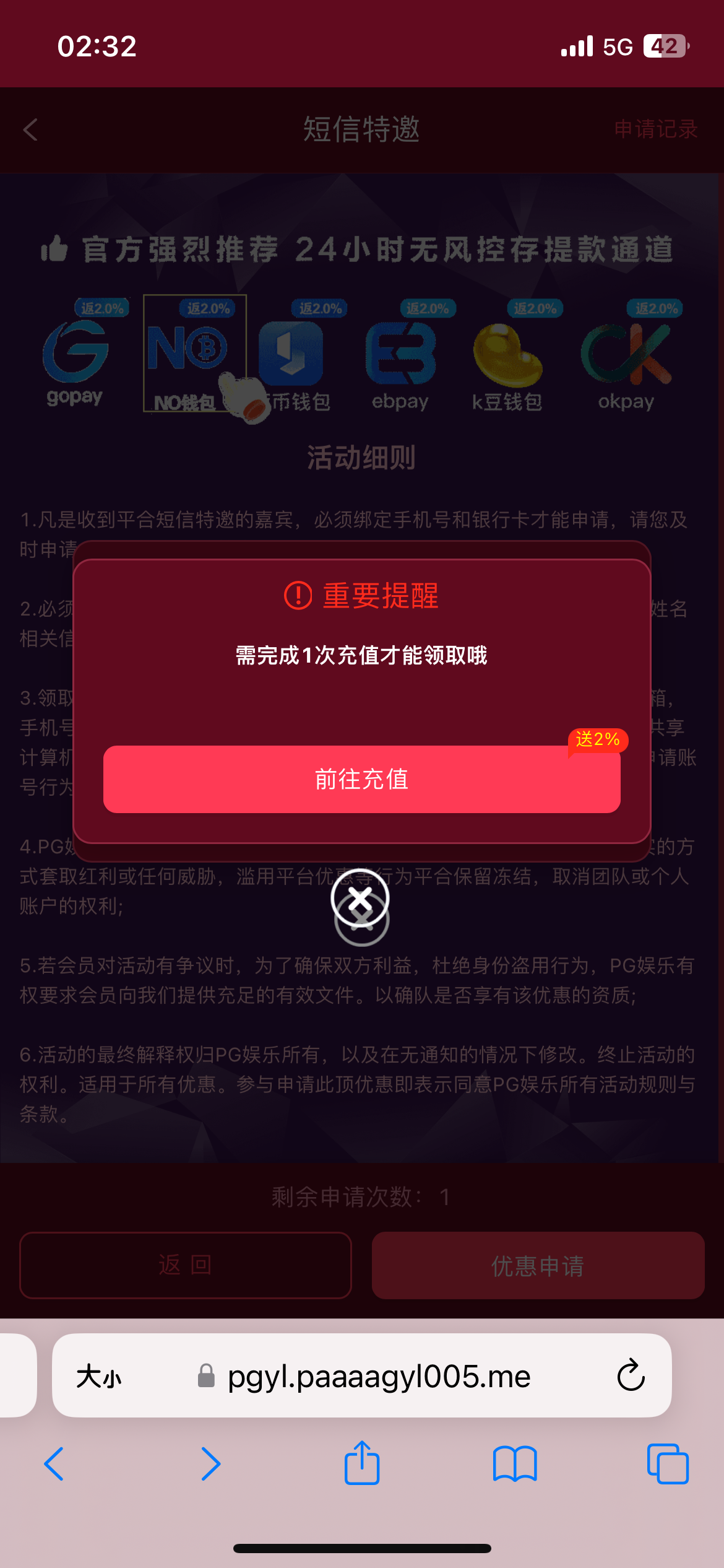 http://662726.vip这个网址我也收到短信了,但是要充值1才能申请。