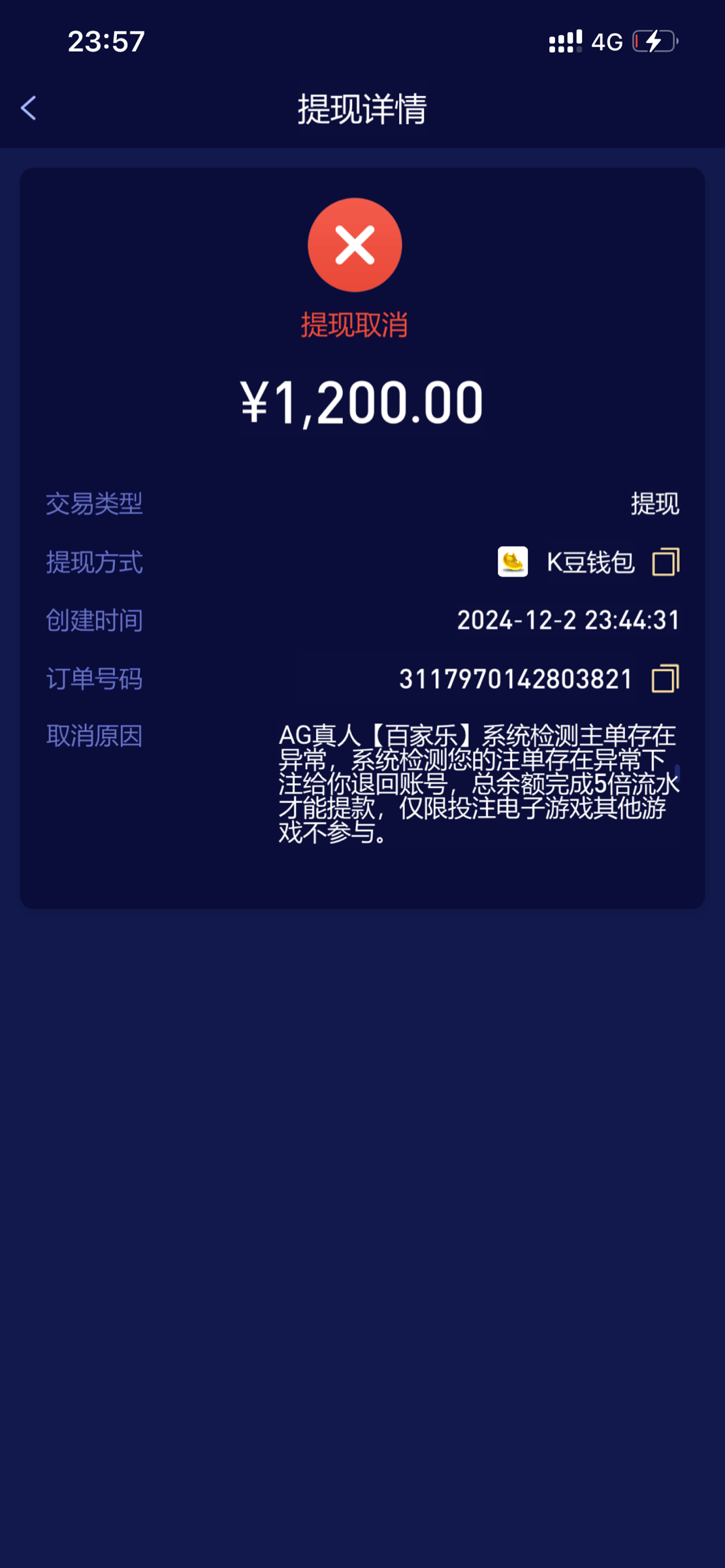 我今天1056凌晨玩电子输了700,然后又充500打AG真人,打了一下打到2100提现被搞了退回来让我打五倍流水,打了好久还差2268流水,余额1900。后面有点不敢下了下什么什么死,我就想了个办法拿备用机另外一个台子也充了1000,找了AG同一个桌台俩边对押刷流水,下到第三把的时候,神奇的一幕出现了,我俩台手机庄下1000闲下1000,结果俩边都是输。给我愣住了,然后我立马去个人记录看投注记录,结果俩台手机这条投注记录都没有了,给我气死了,输不可怕,这样输太憋屈了,以后真的再也不玩真人了。我想发图片给你看的,但是投注记录又没有了,当时开奖的时候我愣住了图也没截上,但是我说的句句都是实话,好家伙我有时还纳闷为什么可以连续七八把不中,现在看来都是有迹可循的。