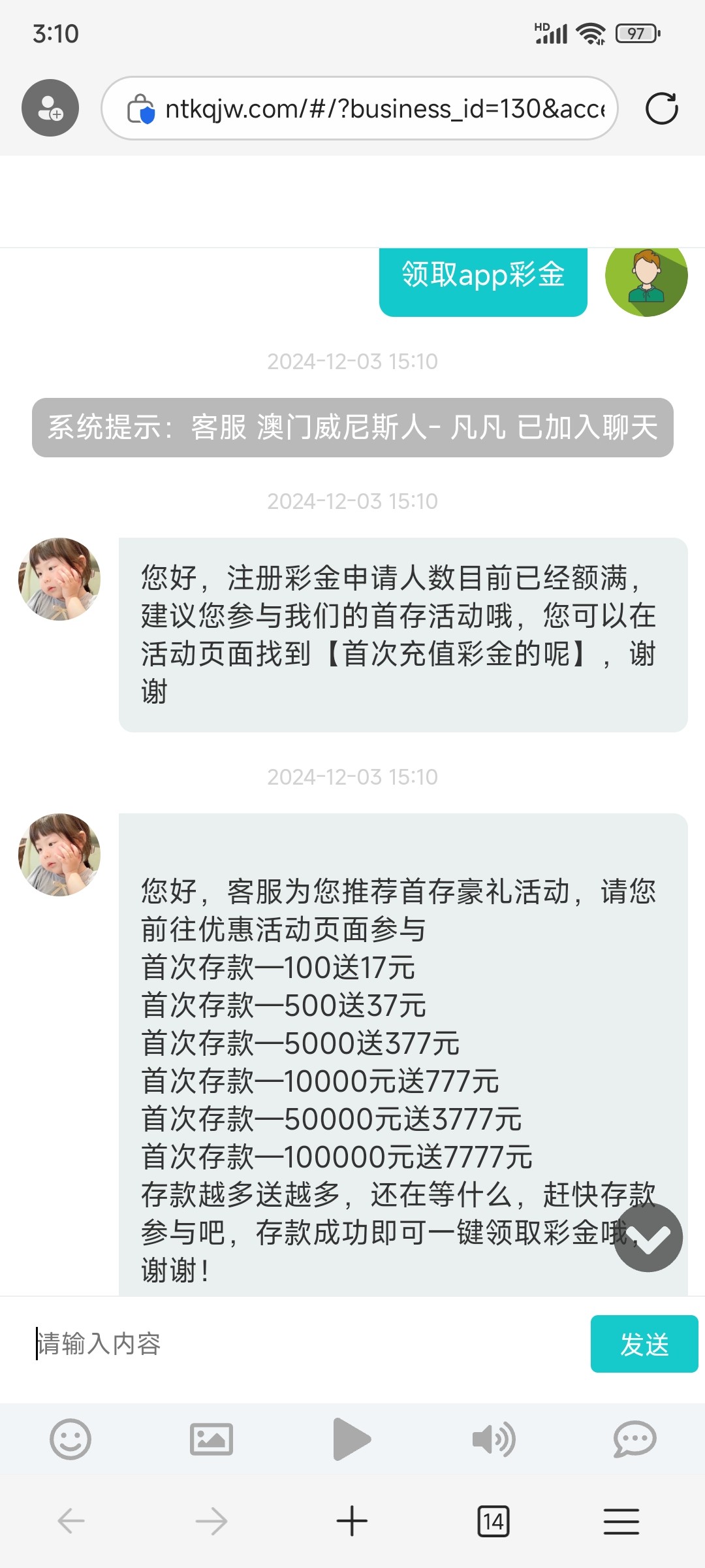 这个威尼斯,我是12月1号注册的,今天给我打的电话,看看能不能申请到注册彩金,申请不到等电话就行 地址 77733377.com