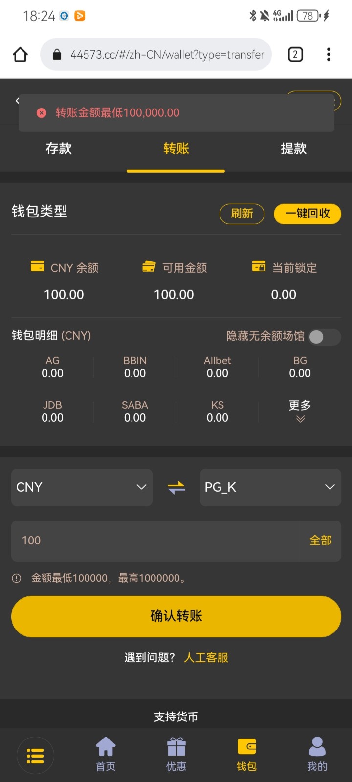 刚才接到个电话,说什么注册送 然后去充值了100+100, 到账100 后面发现进个游戏他妈的要10万块 真他妈傻逼了这他妈纯纯诈骗平台呀