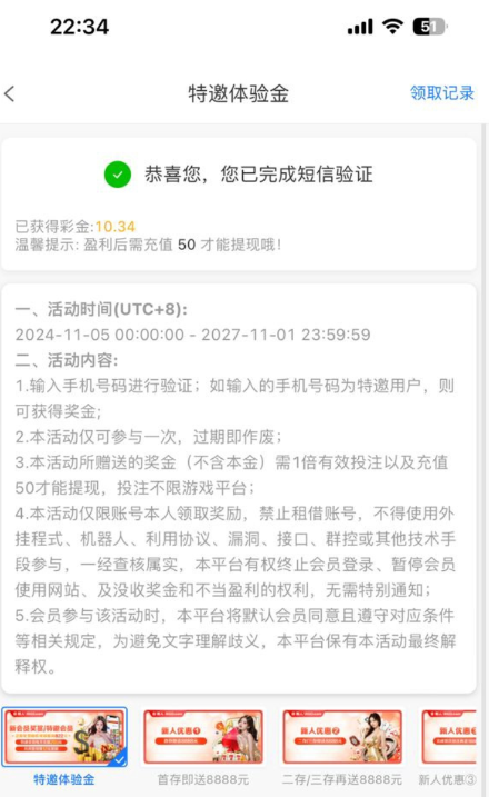 新账户注册绑定信息,自助验证特邀活动,随机送彩金10-88,但是提款要存款50才可以,具体不清楚,出款自测! 地址 8022.com