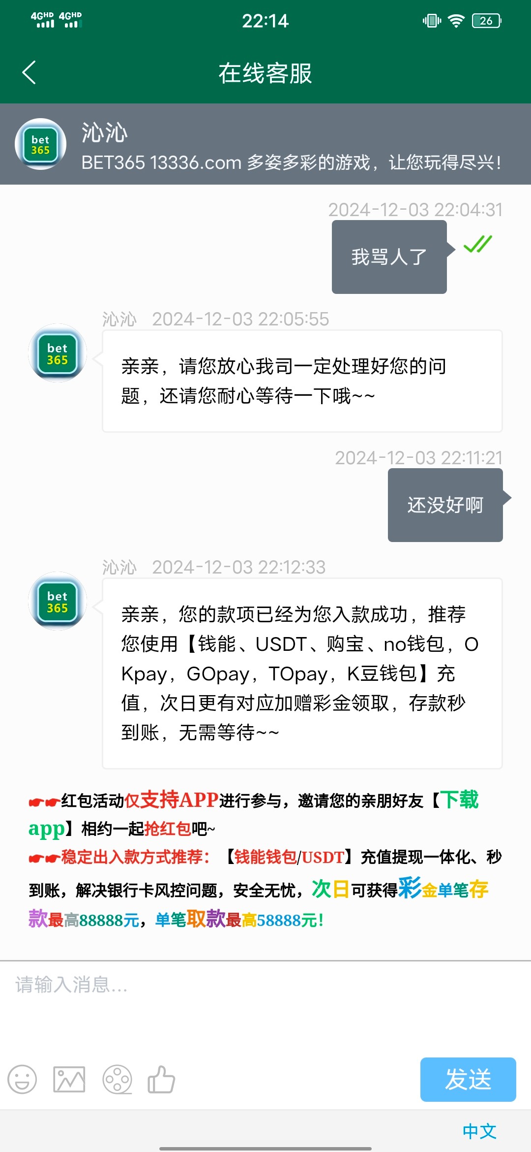 下午那会用老哥一体化 在bet011 哪个银联转账随手点一下充值100 然后出来去找客服说充值没到账 然后把p的图发给了他 催了半个小时居然到账了 因为那个号是我拿的小号 钱包跟卡都被封了 所以就没提出来 但是过了几个小时都没有扣款情况发生 后续拿别的号再去重复操作发现不行了 可能那会运气好 如果卡跟钱包没封的话应该是可以出的 因为是朋友的号 一百块钱也没必要麻烦他去重新注册一个钱包 想着打多点 最后挂逼了