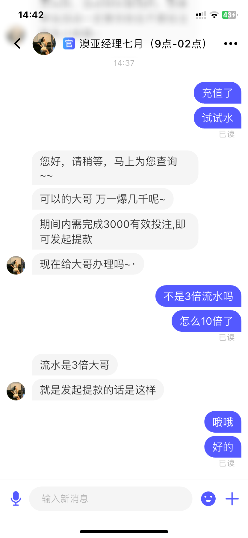 打电话说让我充值200送100 打满500流水就OK了 充值完让我打3000流水 这种前面一套背后一套的台别玩