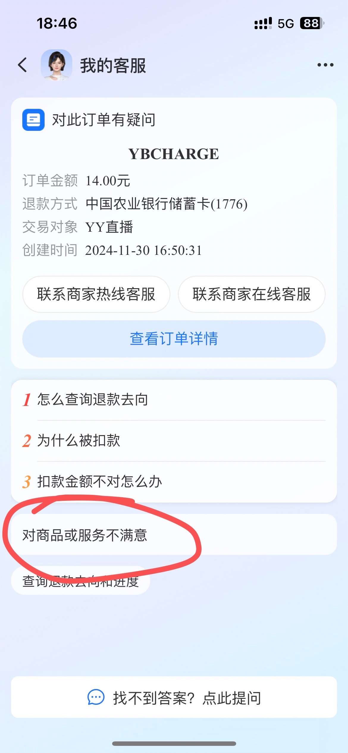 YY退款全给退了,上个月底有订单的都去试试吧,免费分享,点投诉,仅退款,未收到提供任何服务,然后等商家回复就是了。