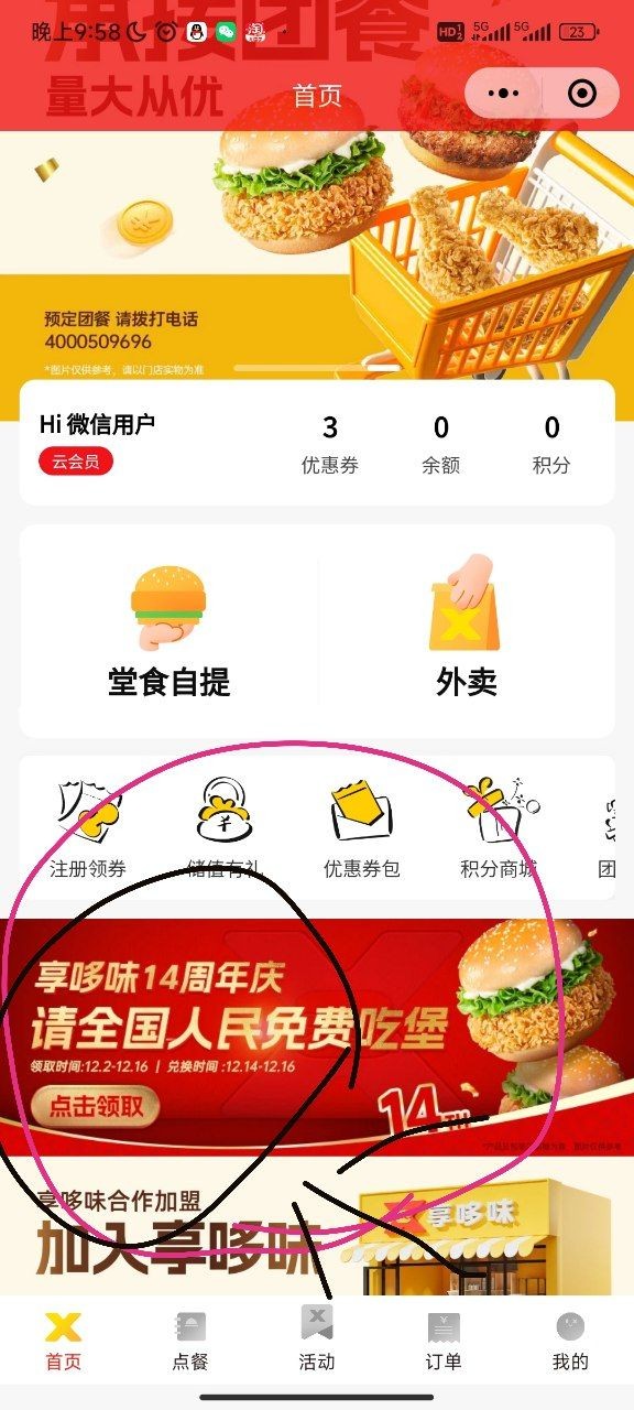 i享哆味小程序,点14周年请全国人民吃汉堡,领取之后明天才能去吃汉堡,14~16号都可以,挂逼的老哥明天的中午饭有着落了,不要白不要吃就完了,领到了,明天再去,现在不减的要14号明天