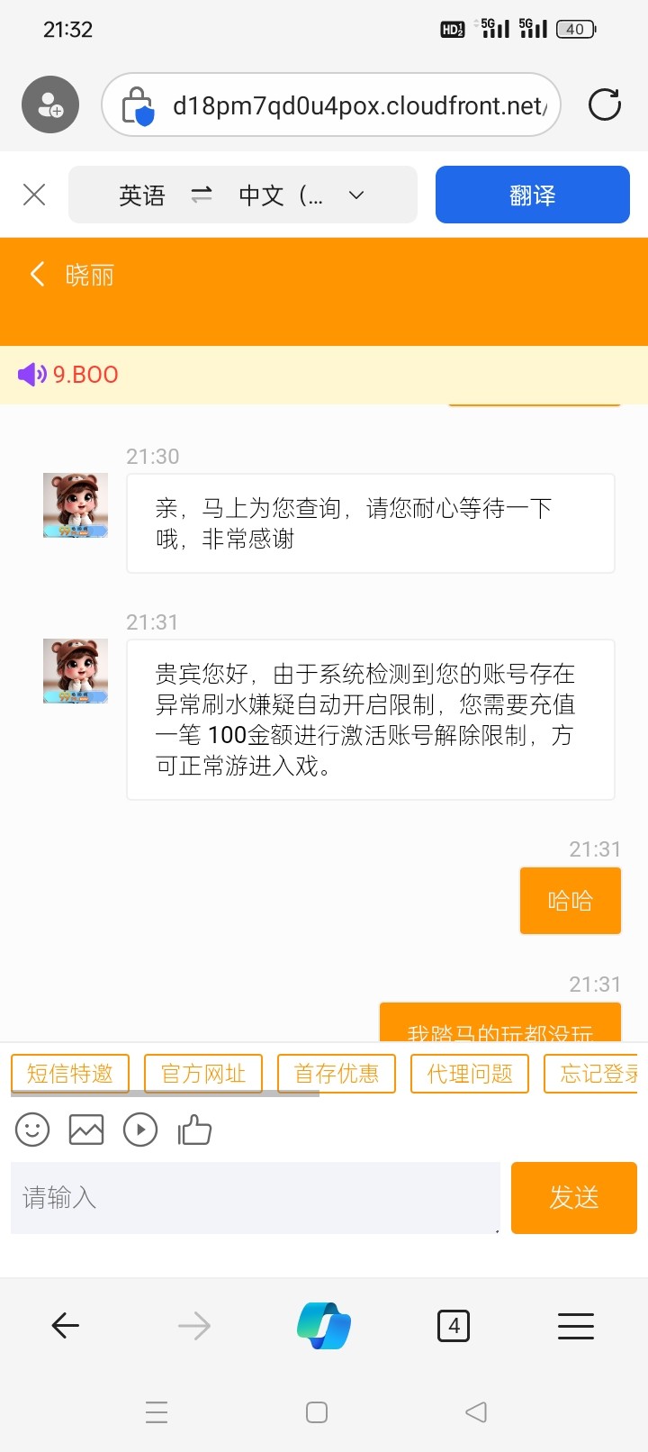 贵宾您好,由于系统检测到您的账户存在异常刷水嫌疑自动限制了,您需要充值一笔 【100】 金额进行激活账户,方可正常游戏。