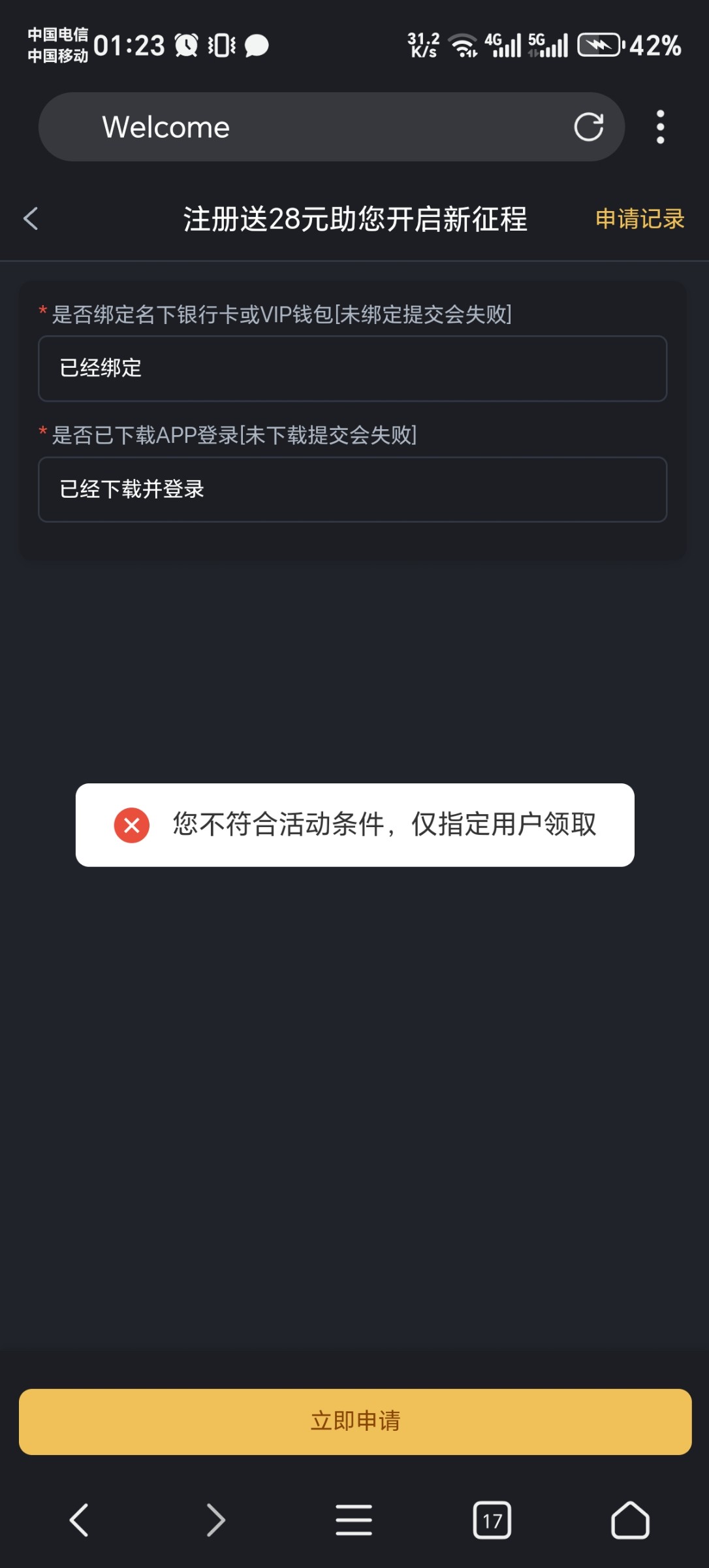 没短信的不用去了 注册 绑定好钱包 活动就点不进去了