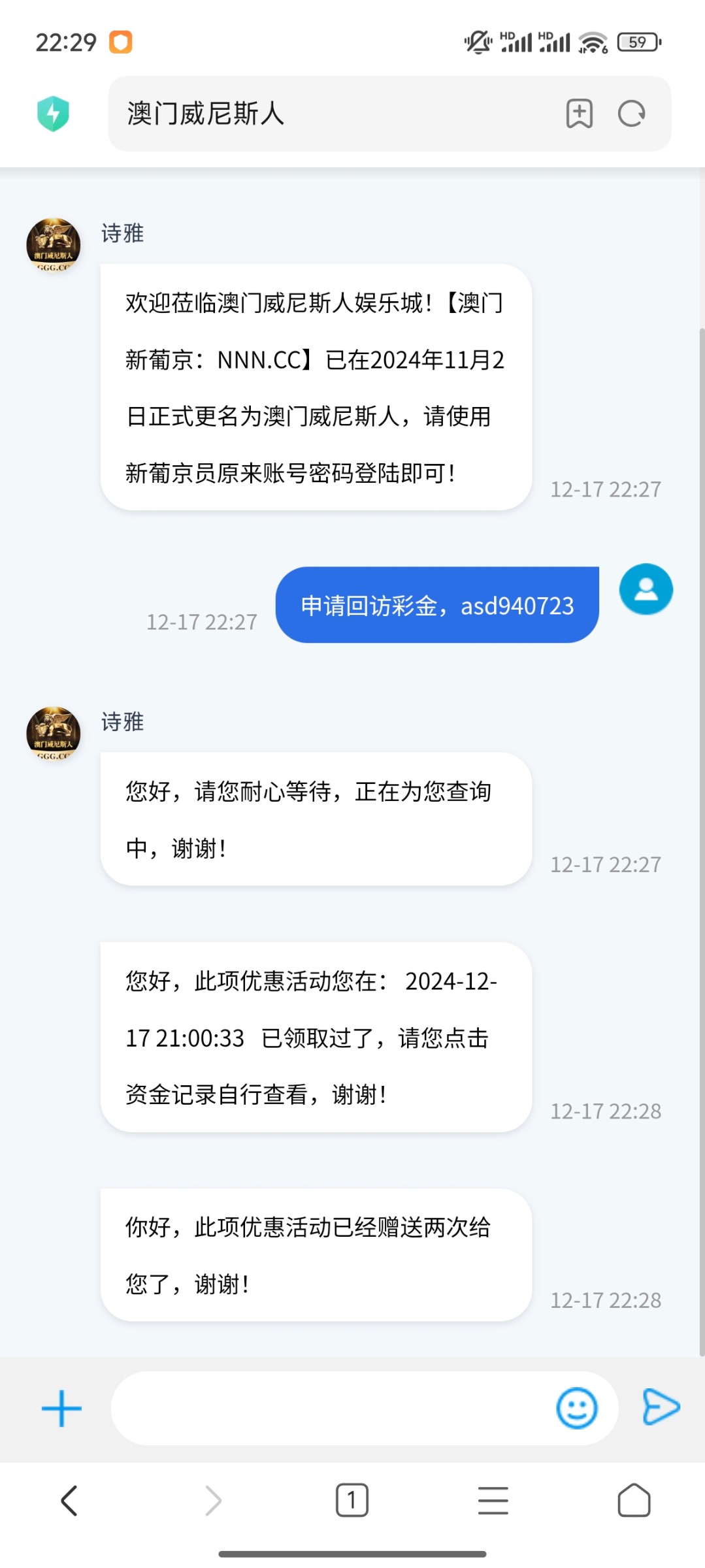 注册了1260多天,之前充值过好几次的,好像是黑色金沙威尼斯人改版来的 ,去申请回归彩金不肯给
