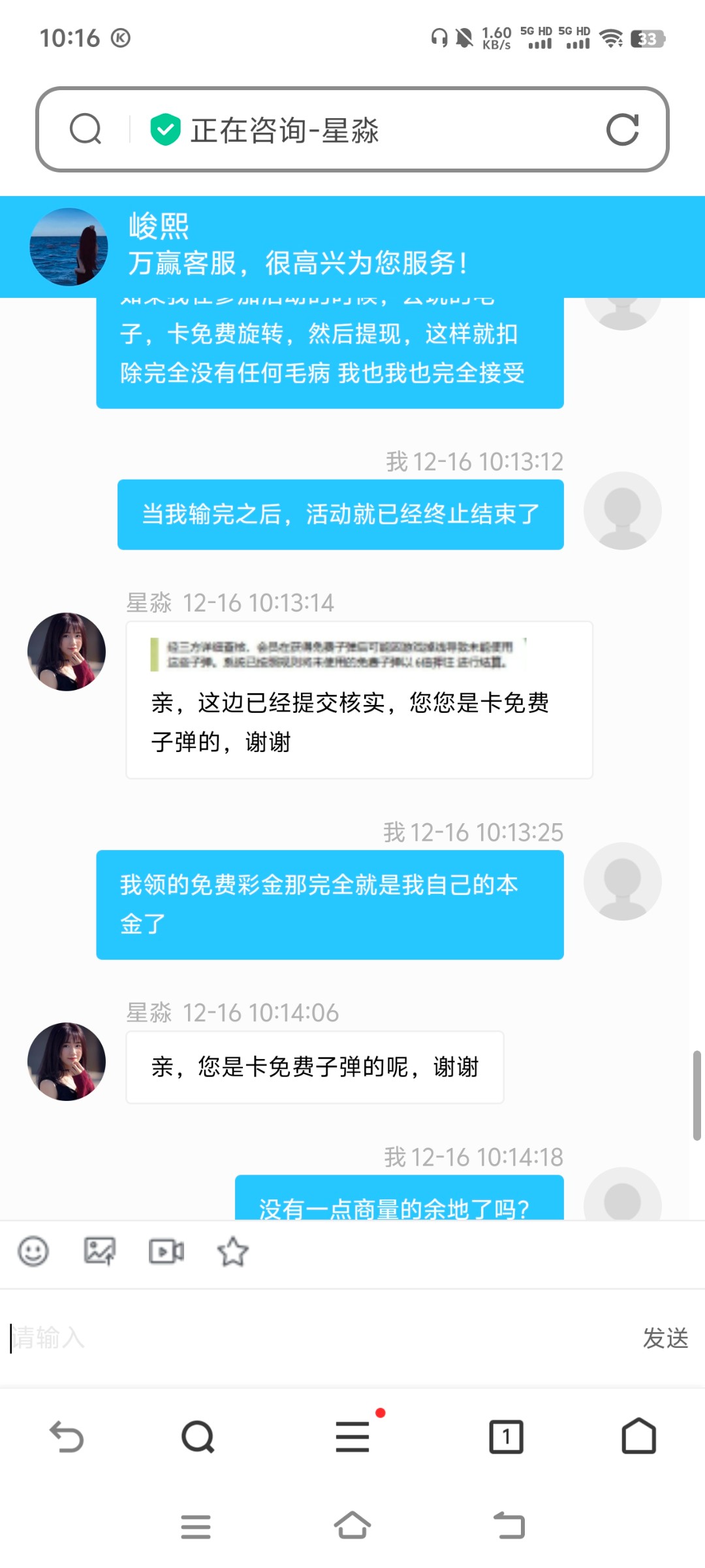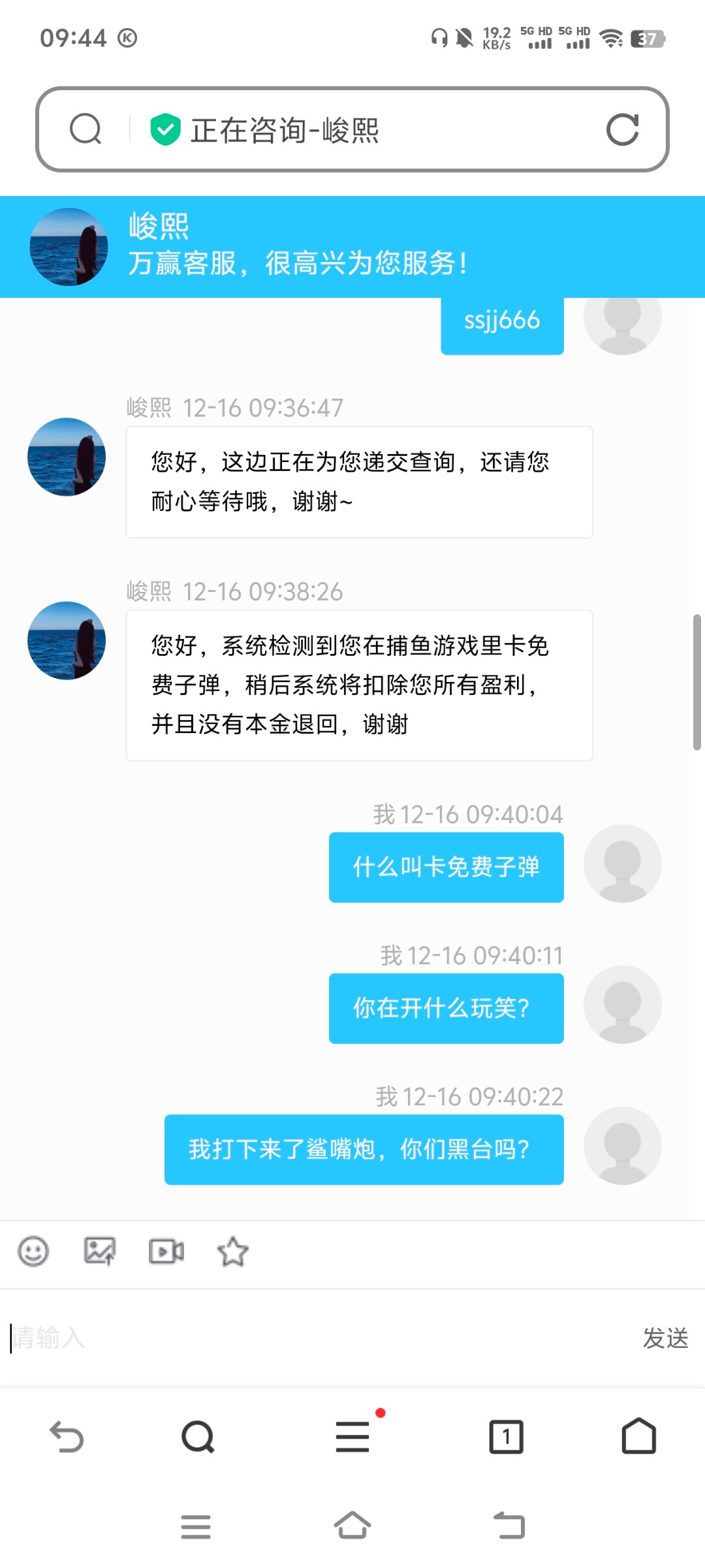 我是万赢几年老玩家,目前V5等级,月俸禄188元,今晚我正一如既往的参加万赢的500+208午夜彩金活动,不出意外的输完了。输完之后我就领反水,签到彩金,充值彩金等一系列加起来有50块钱,然后我就去玩JdB五龙捕鱼,10块钱一炮打鲨嘴炮,没想到下来了,我就兑换成人民币1850元,然后提款,提现了2小时还没到账,我找客服说我在捕鱼游戏里卡子弹,你说我参加活动卡电子的免费旋转那确实违规,但我是在输完之后领的免费彩金而且捕鱼还有卡子弹这一说法吗?客服把我盈利以及本金全部扣除,以及我的VIP等级等优惠活动都取消了,万赢不要玩了,现在是完全黑款。