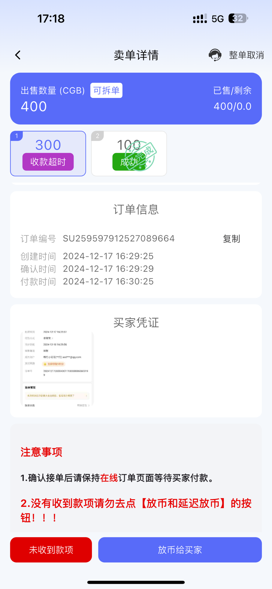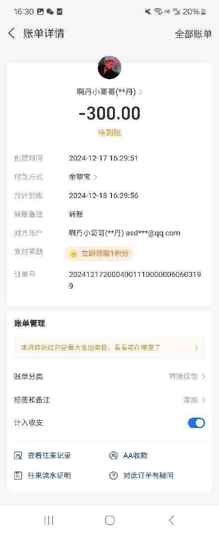 他点了24小时后到账 是支付宝返诈弹的提示他点了继续 应该等24小时就到你号了 到时候在放币给他