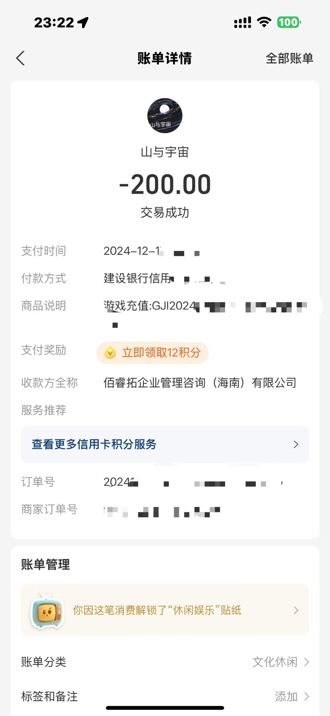 支付宝充值收款方全称 佰睿拓企业管理咨询(海南)有限公司可投诉退款,方法跟之前一样随便找个赌博平台账号冻结的图上传,