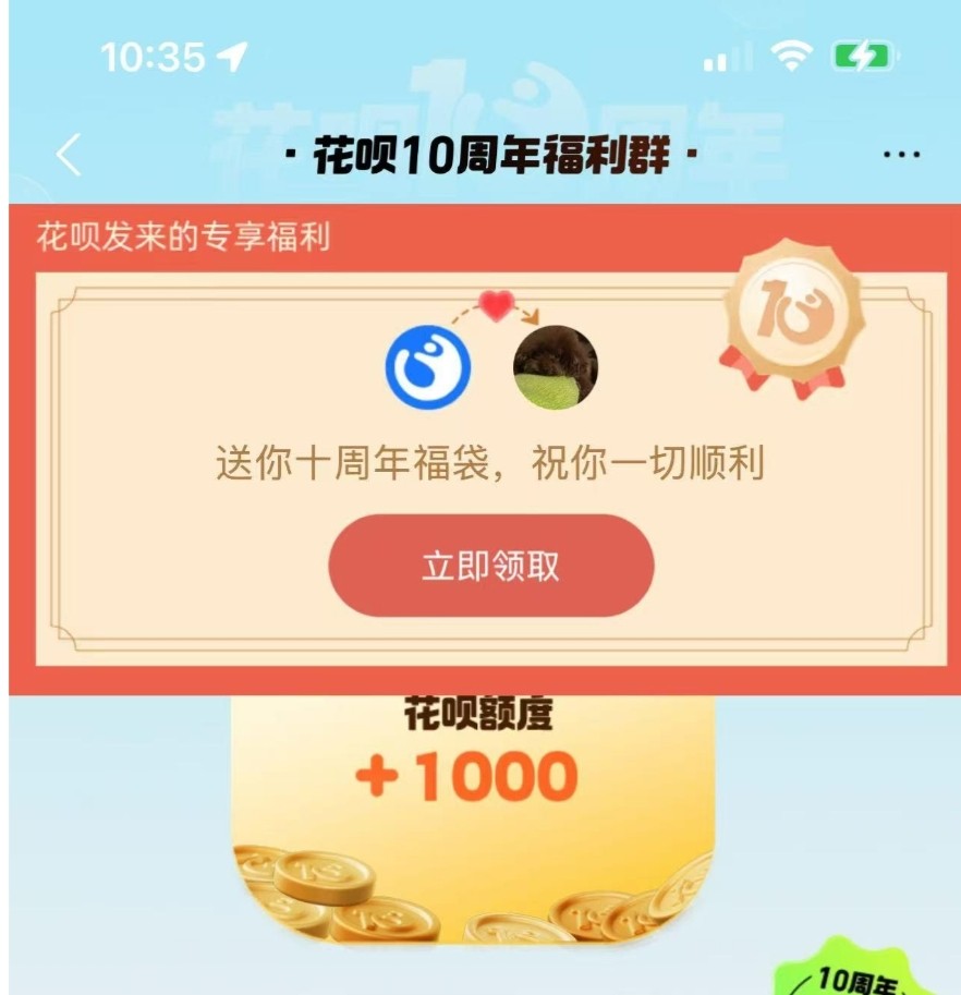 今天花呗10周年,没饭吃的去打开支付宝花呗看看,有个十周年活动,点进去!有可能得到花呗分期额度劵,解一下燃眉之急,只是有可能,你征信一塌糊涂肯定没有。没有的也别乱喷!可以买烟点外卖,不要拿去打狗。