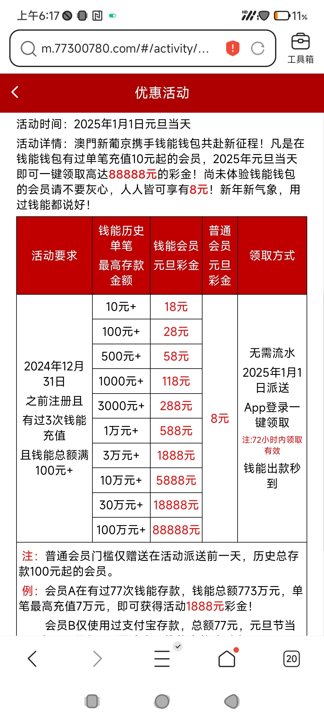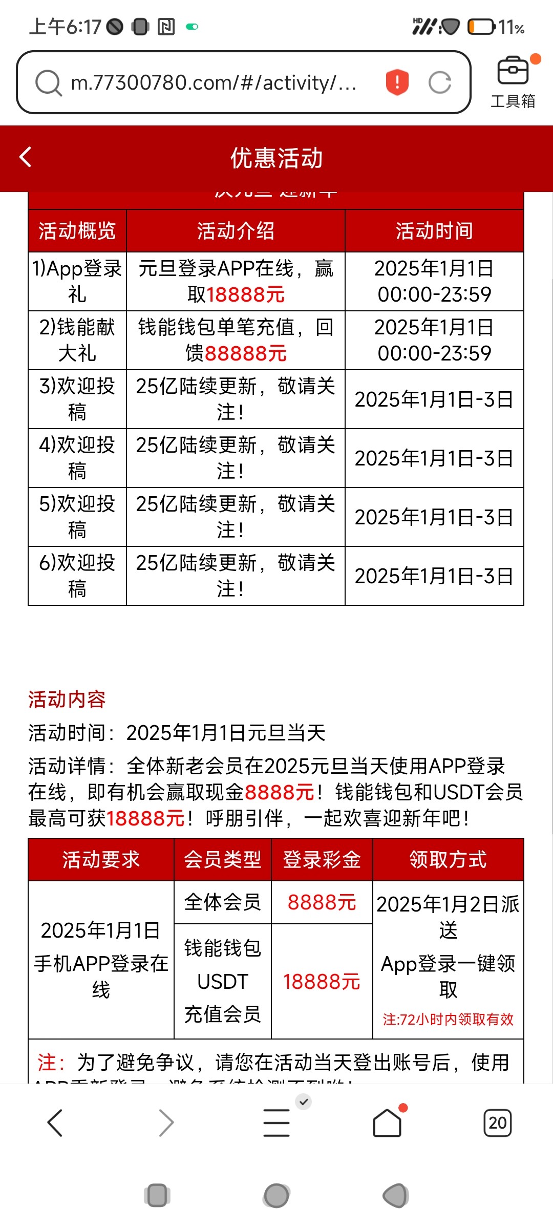 773的元旦回馈已经出了两个了 估计其他台的活动也一模一样八九不离十了 精彩系列真的一年不如一年了 现在都只回馈钱能单笔最高存款了 以前都是任意充值最高存款 对于我这个经常不咋用钱能的人来说这波血亏 就看看除夕有没有什么别的活动了