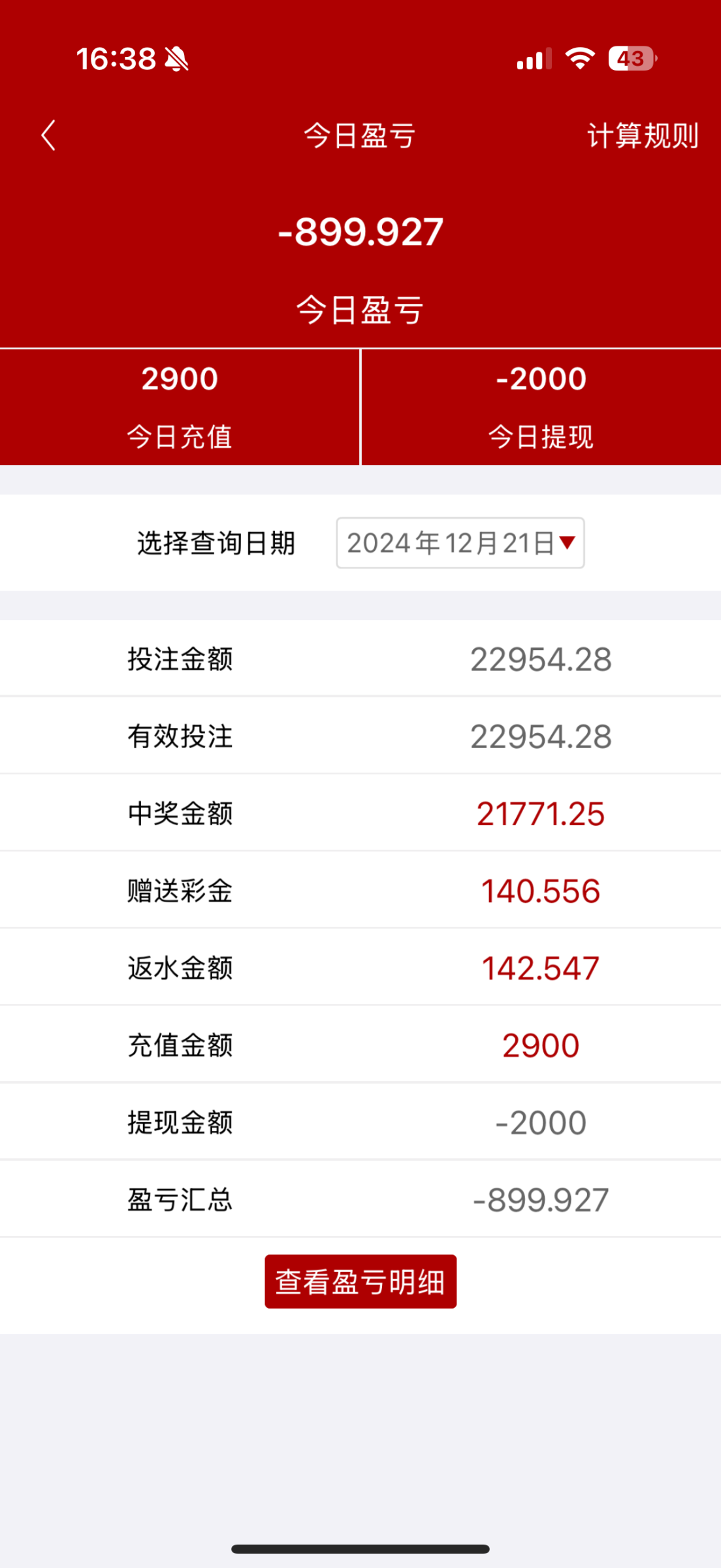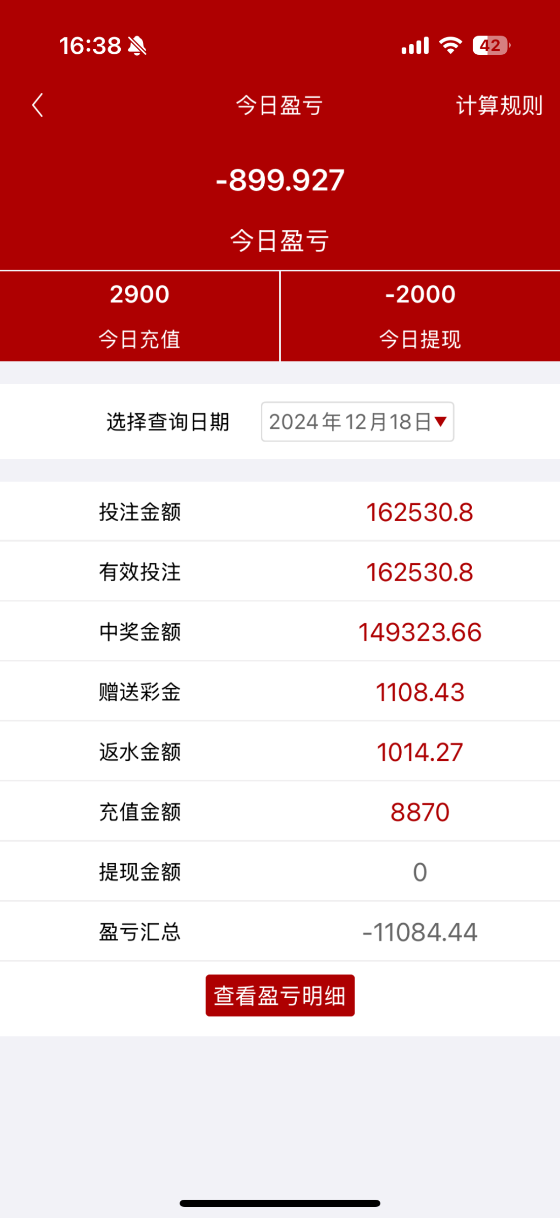 这个月12号90上2.7w,13号领了1600彩金输完了,反水20又上2.2w差不多,然后20号100上1.2w,21号反水又上1.2w差不多,不过基本都送回去了,就还了三四千债,发了家里5k,消费了一下,基本上都送回去了
