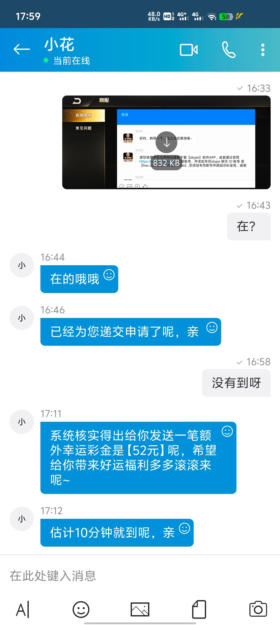 有充值过的去找在线客服说申请电话回访彩金,他会让你下载那个软件加专员申请,我没接过电话,送了52出了100 地址 768.app