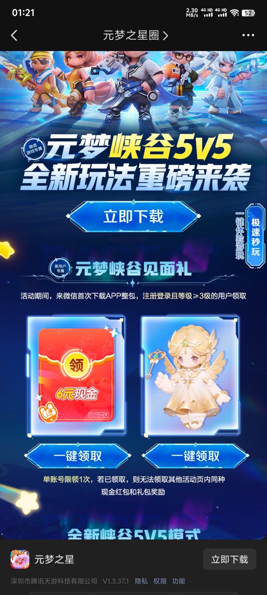 第一圆梦之星微信游戏搜索圆梦之星福利,找到活动如图,玩两把排位升到4级领6米,没搞过的微信才行,多号多撸。