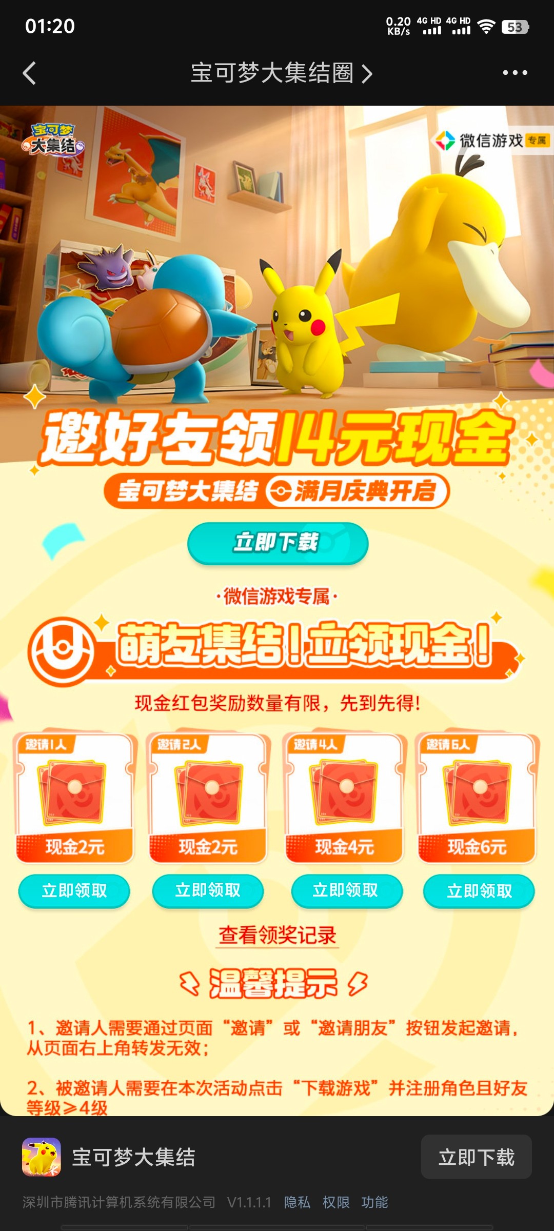 第2个宝可梦大集结,同上找到活动如图,多v直接发另一个v领下载还能领邀请撸羊毛都懂。也是一v6米