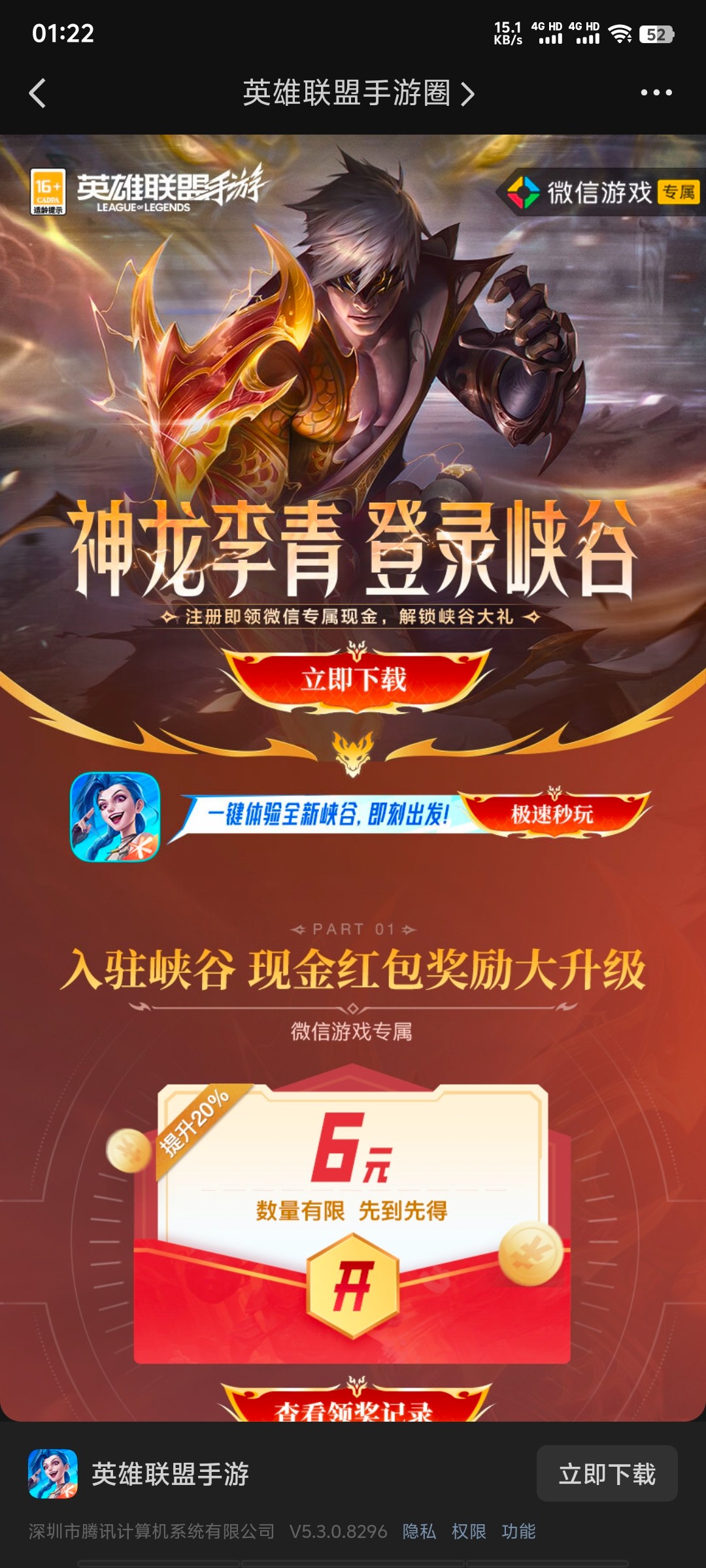 琢磨明白了,英雄联盟这个,领红包页面不要点下载,直接点秒玩,进入游戏选好英雄开局点右上角的跳过,直接会结束会升2级,然后关掉游戏,退出领红包页面,重新打开红包页面点领取,全程大概2分钟领一个牛子,30几万份,几乎人人都能撸到