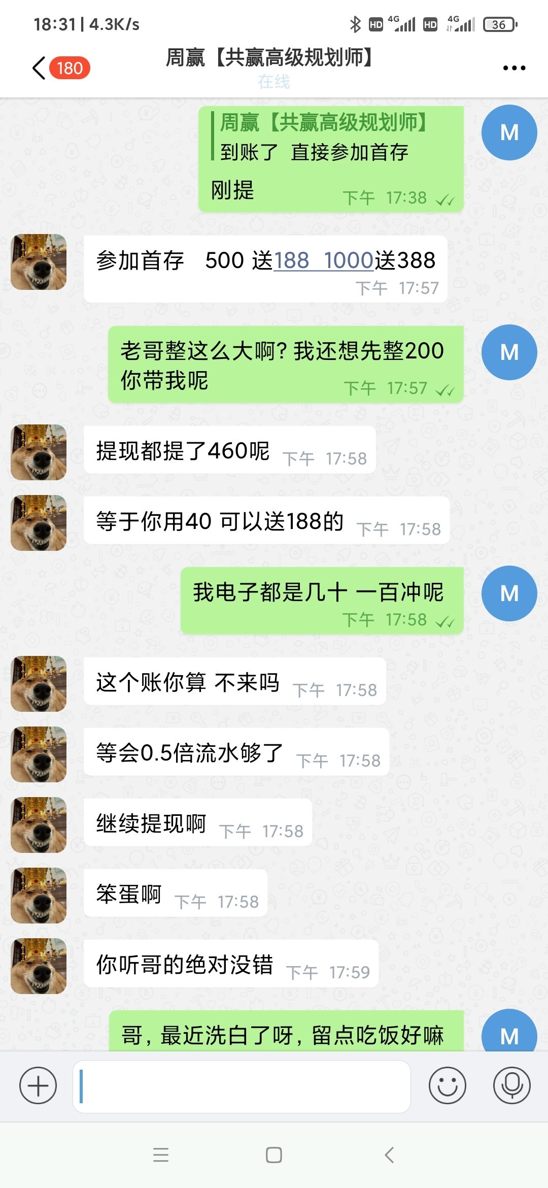 @wen663 ,那种电话来的100送36加盈利50的全是傻逼 狗带一把就让你梭哈136 没中就认栽 中了还得夸他 真傻逼