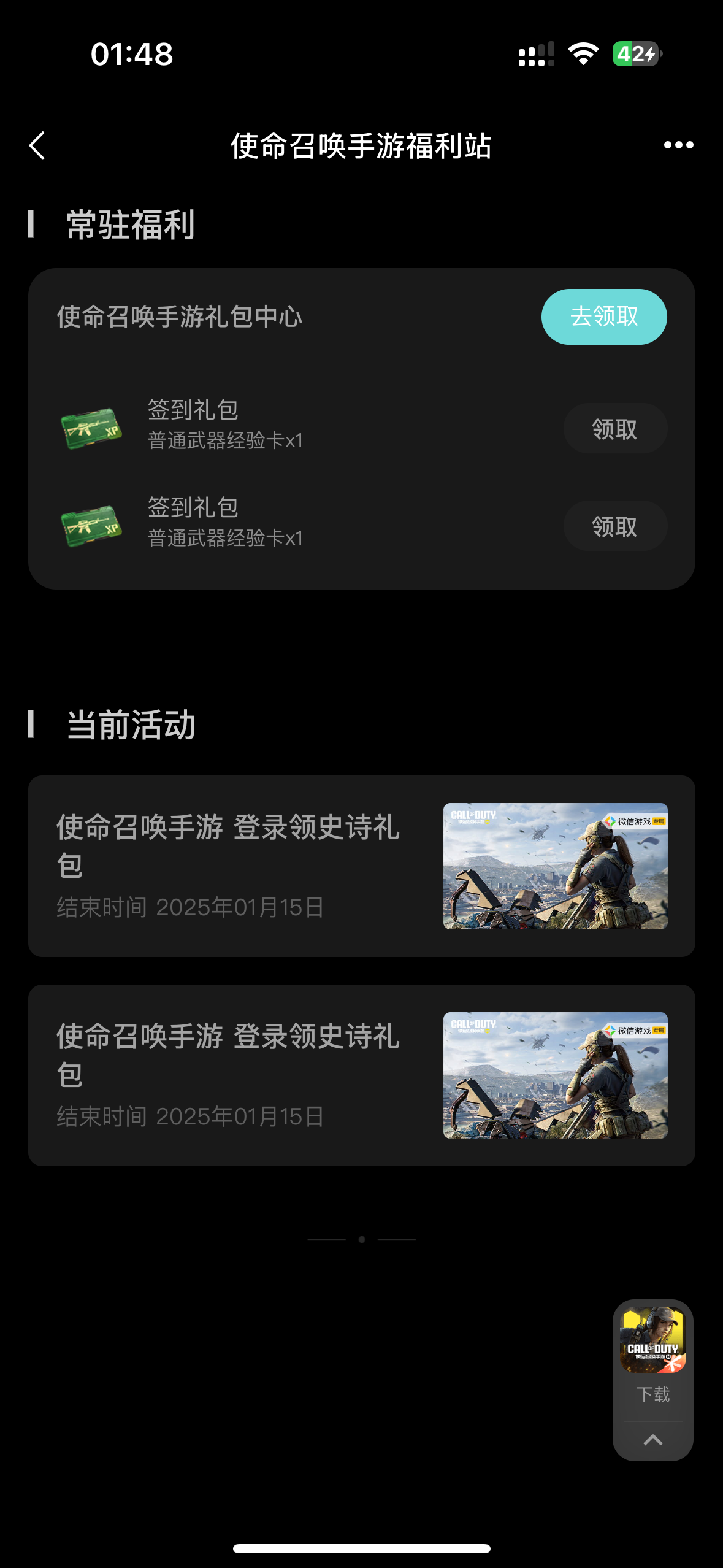 微信游戏里面搜索使命召唤点福利里面两个活动都能领一共4+4 多v多领 下载注册就能领 不用升级 兄弟们冲冲冲 人人豪华猪脚饭