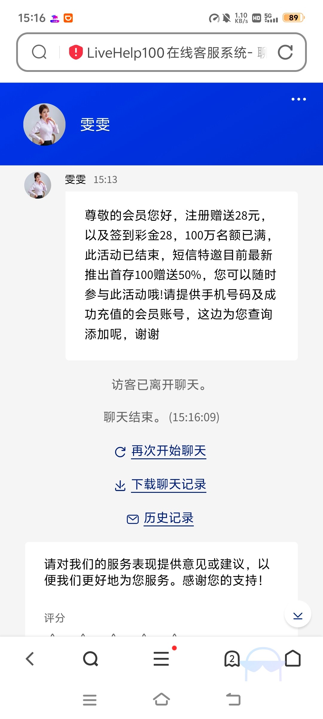 您好,您提供的手机号码不在平台特邀名单里,新会员注册首存可以参与充值100即送50%彩金,多充多送多赚,该活动最高彩金1888,平台有多种活动彩金可以同时参与领取,比短信特邀赠送的彩金赠送还要多,感谢您的支持,祝您生活愉快,多多赚钱,谢谢!