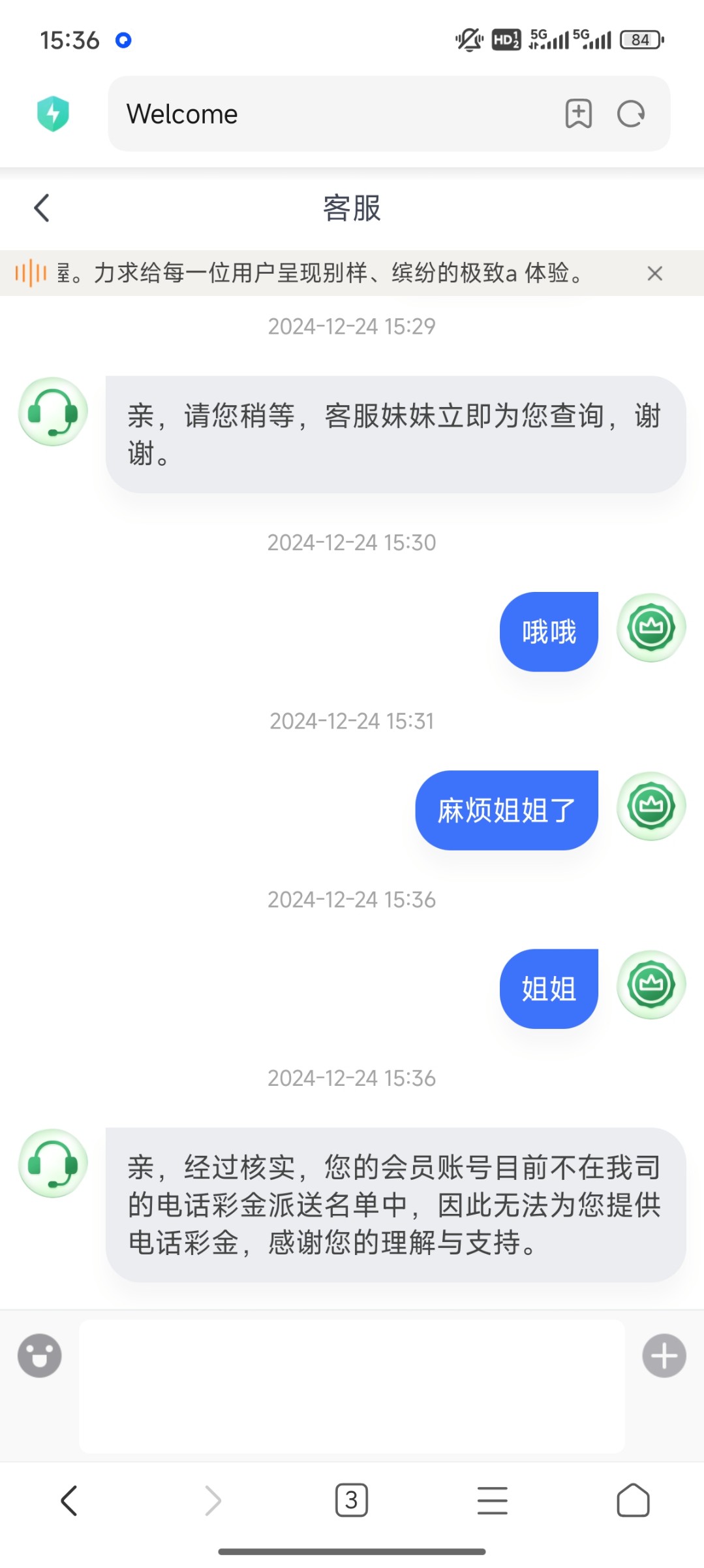 2024-12-24 12:44亲,电话彩金部门反馈,您的会员账号和电话号码不在名单中,因此妹妹无法为您申请,谢谢。
