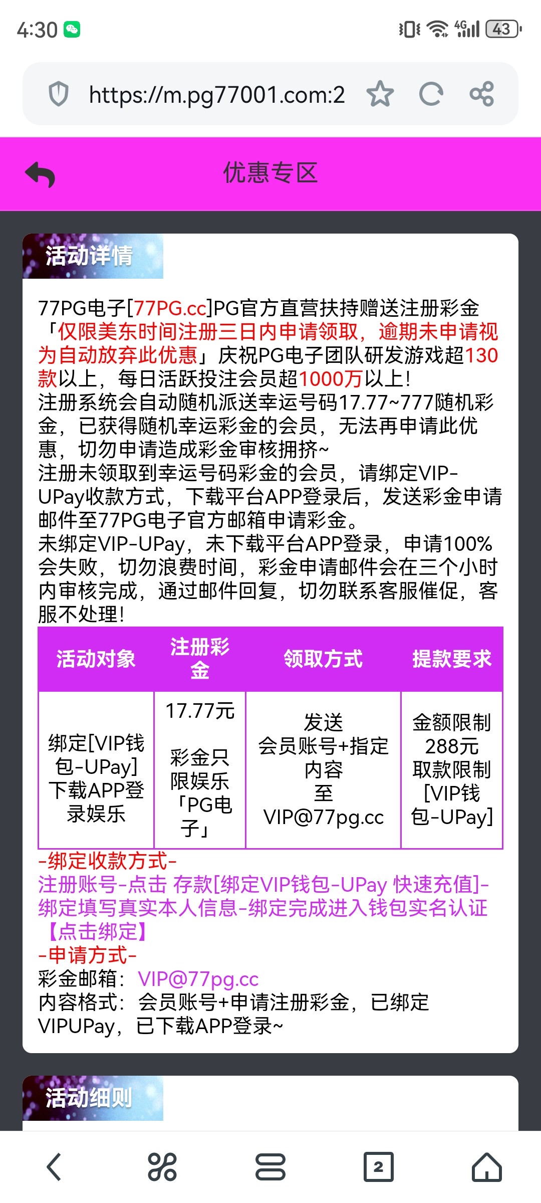 77pg新用户注册绑定小篮板的vip钱包或者upay,钱包必须实名 然后发给他们的邮箱活动界面有介绍送17 出款自测 我提现秒到