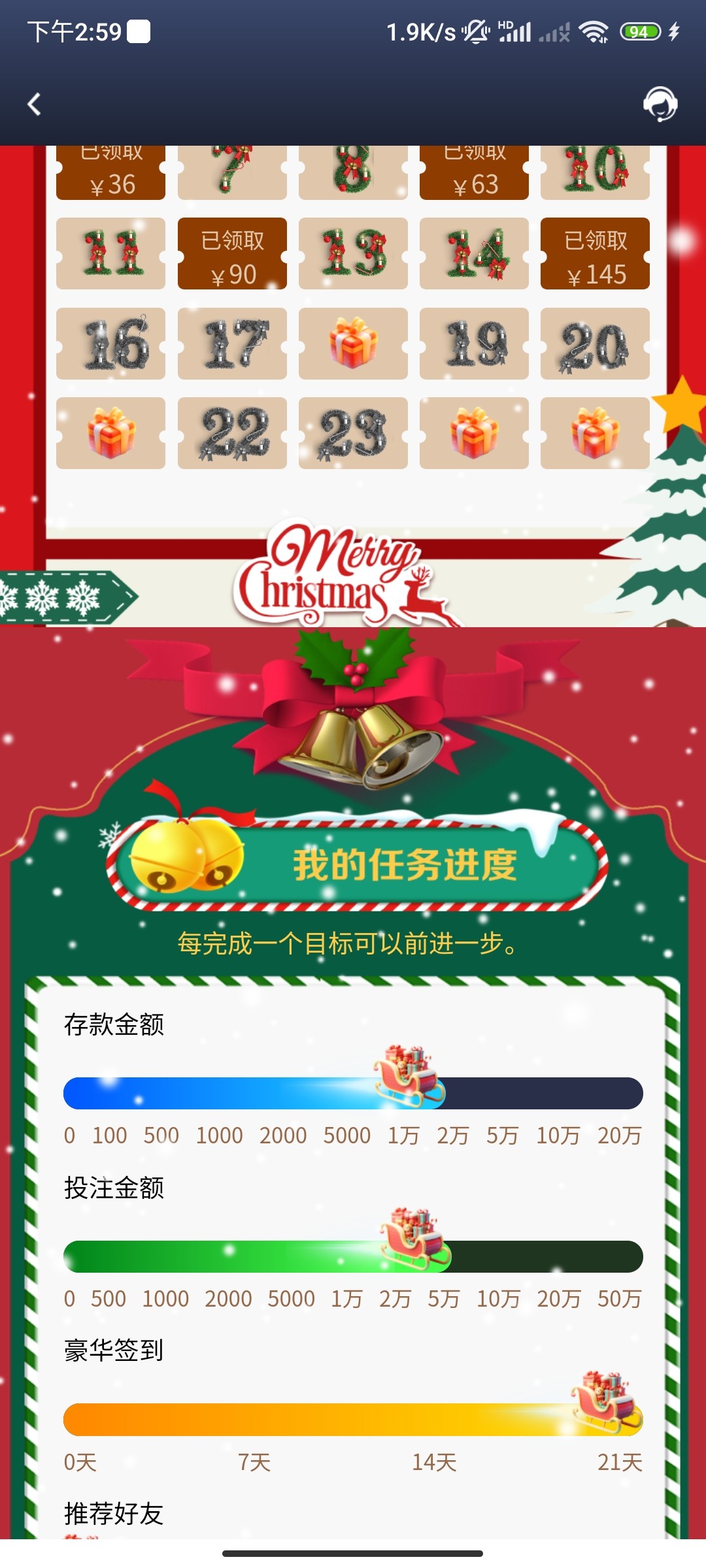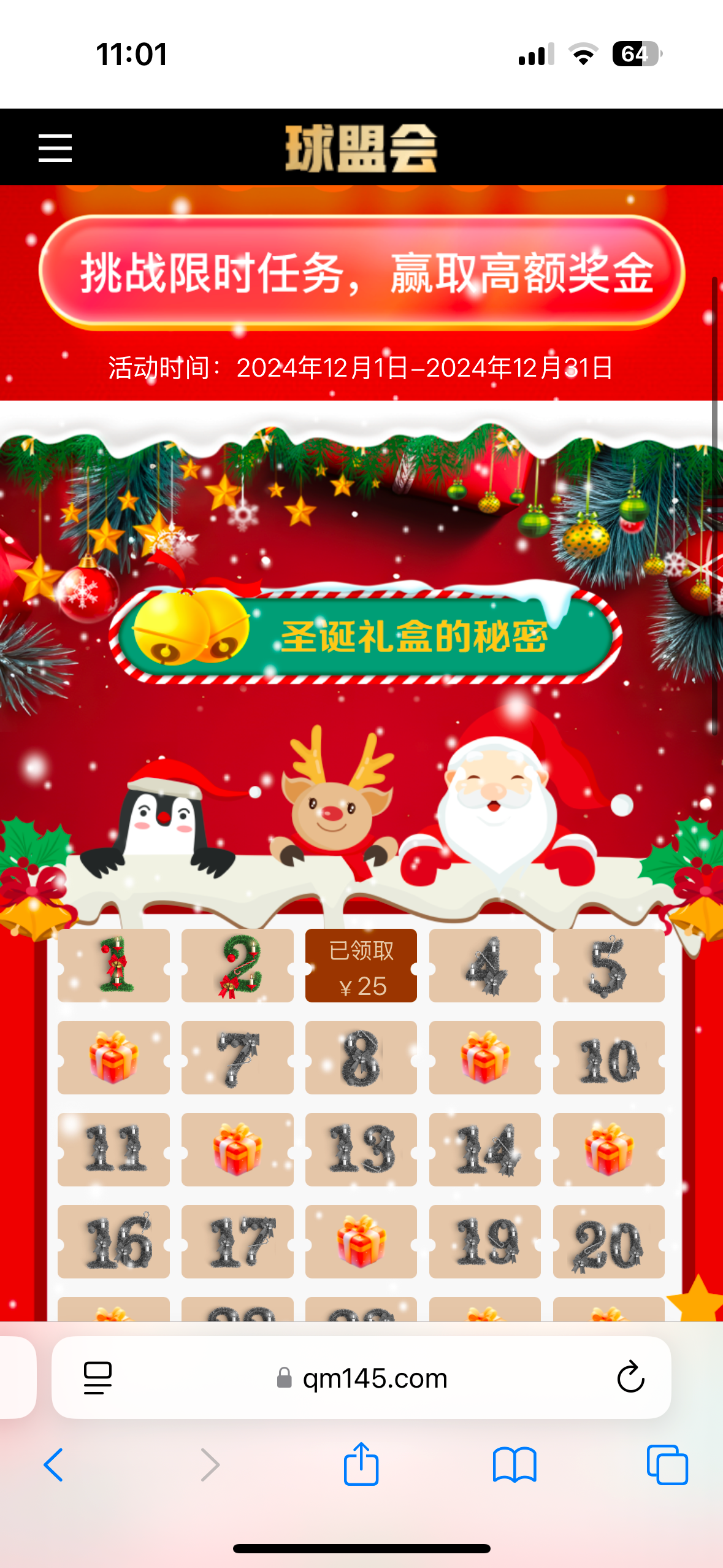 上次有个老哥发过球盟会优惠卷活动充了一百今天才注意到圣诞活动,有充值娱乐过的老哥看一下自己符不符合,完成三个任务就有25,没有的老哥也不要叽叽喳喳 地址 网址,qm145.com
