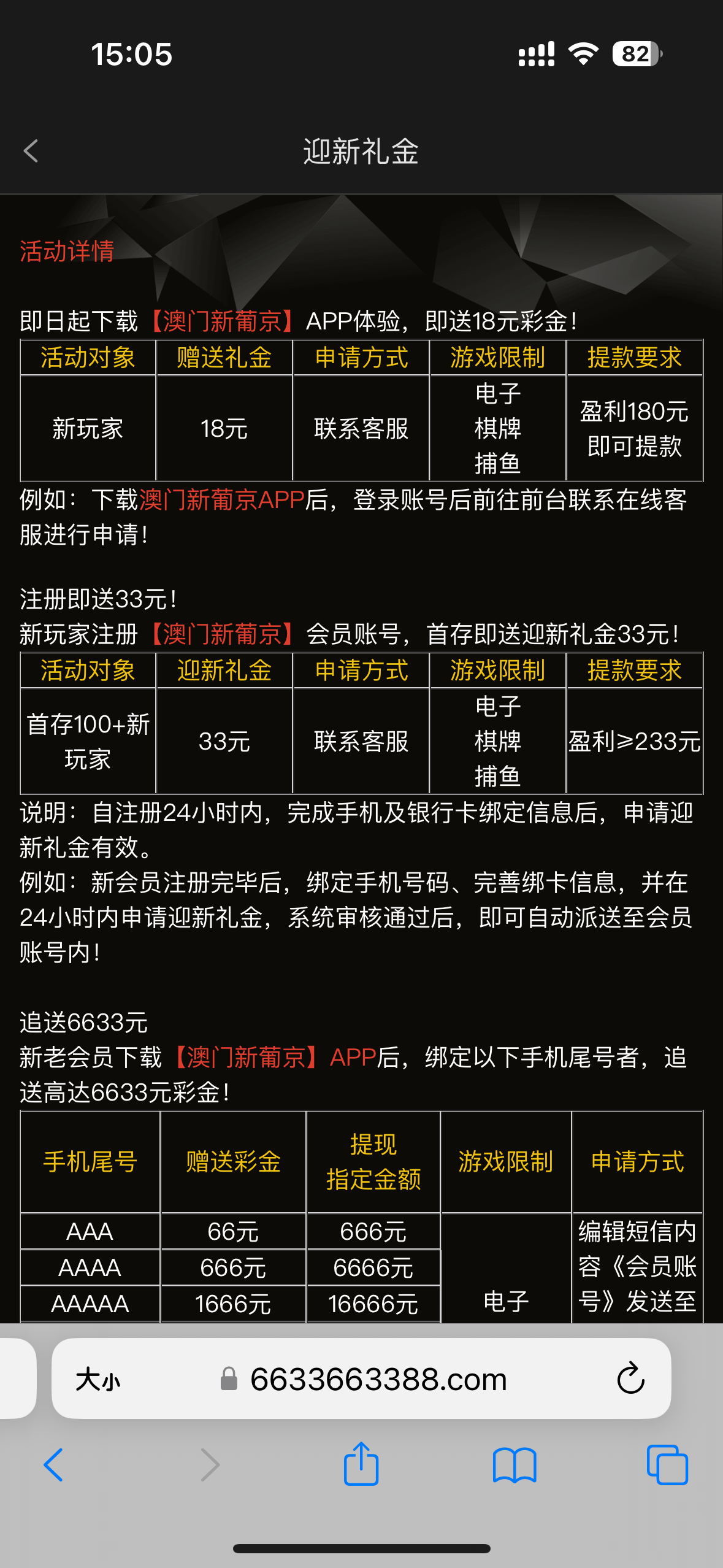 凌晨没事做,在论坛逛看到这个6633有新人注册活动就去碰瓷了,给了18没打出来 ,参加了100+33打出来295。我没收到短信单纯碰瓷碰到的,没事的可以去试一下,链接就是广告区的6633。
