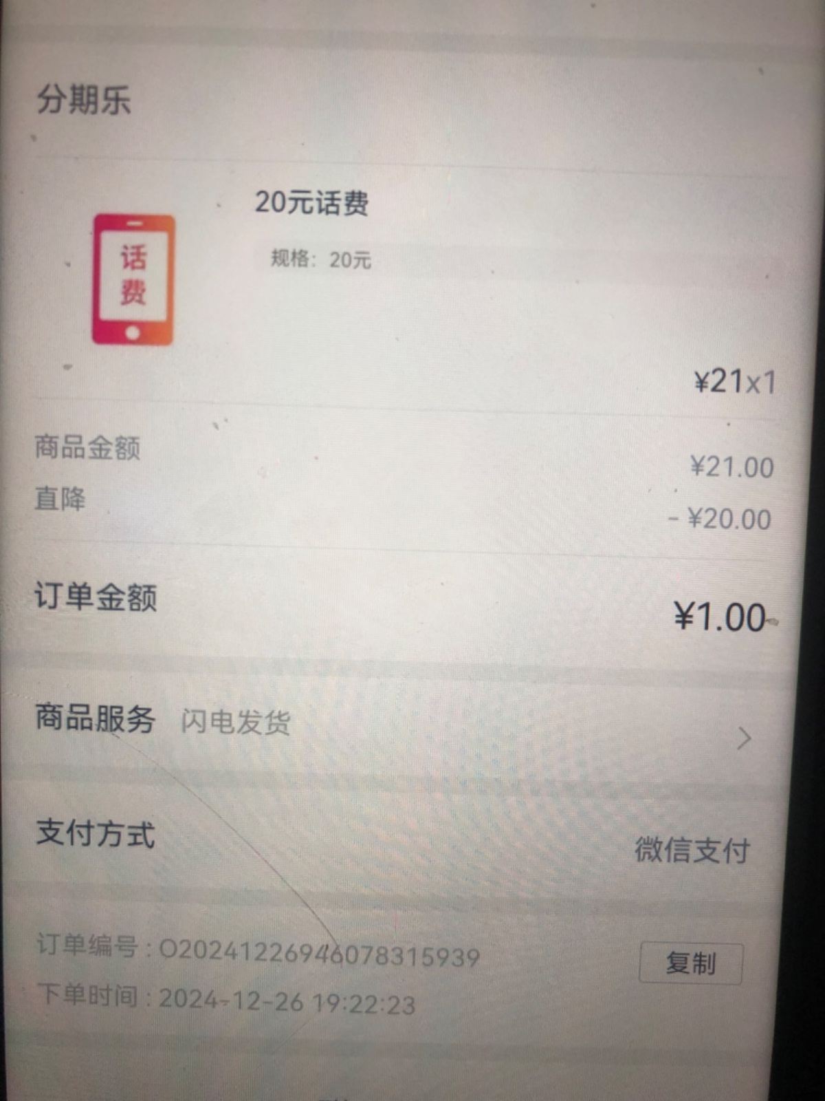 【分期乐】双旦福利!1元充20元话费,圣诞礼免费领,每人限1份,戳 lexfi.cn/f/ItO3l6a3 抢,3天有效,拒收请回复R