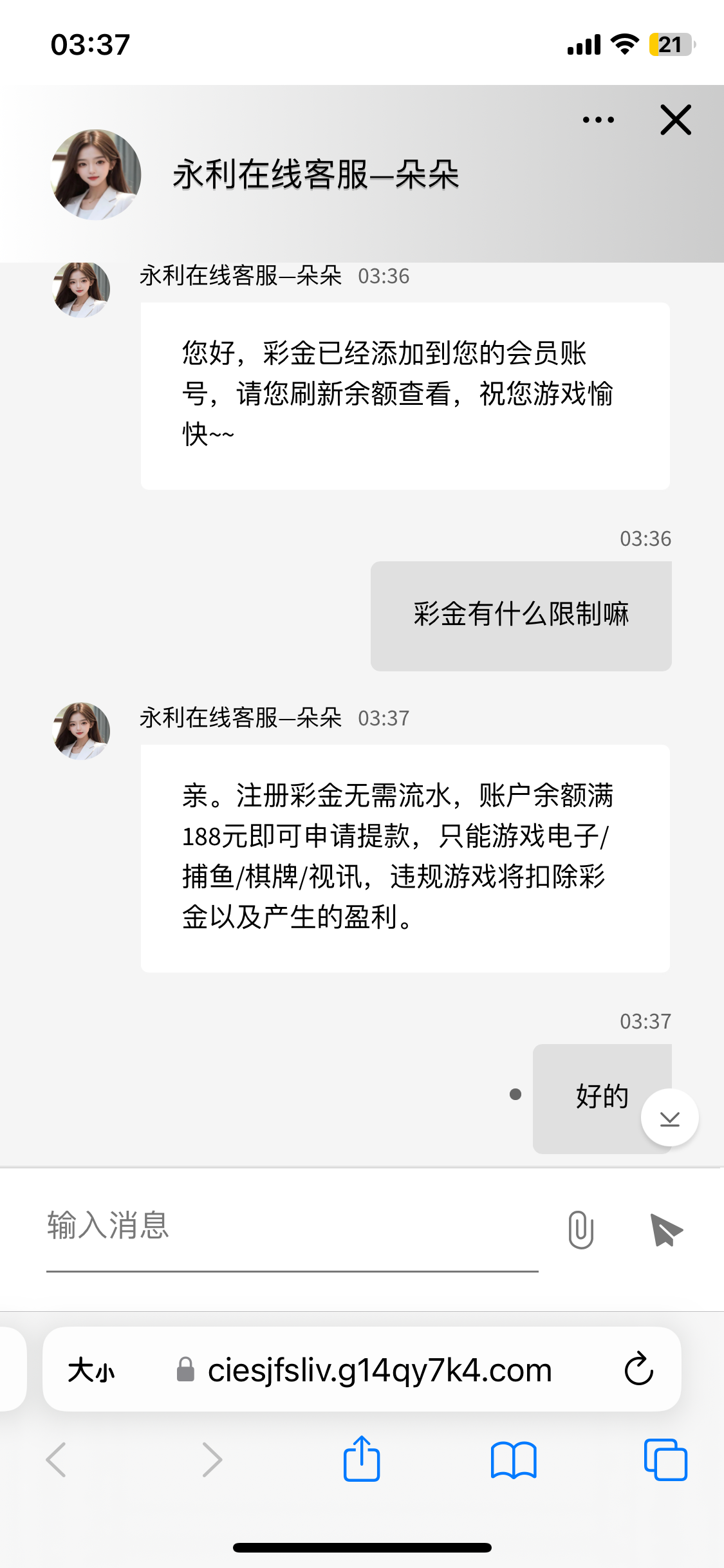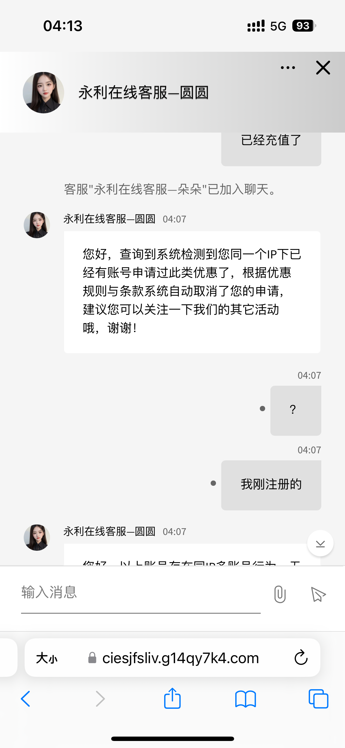 您好,查询到系统检测到您同一个IP下已经有账号申请过此类优惠了,根据优惠规则与条款系统自动取消了您的申请,建议您可以关注一下我们的其它活动哦,谢谢!03:59没有啊 我刚刚注册的永利在线客服—朵朵03:59您好, 这边系统检测到您以上账号存在同IP多账号行为,无法参与任何活动优惠,谢谢~