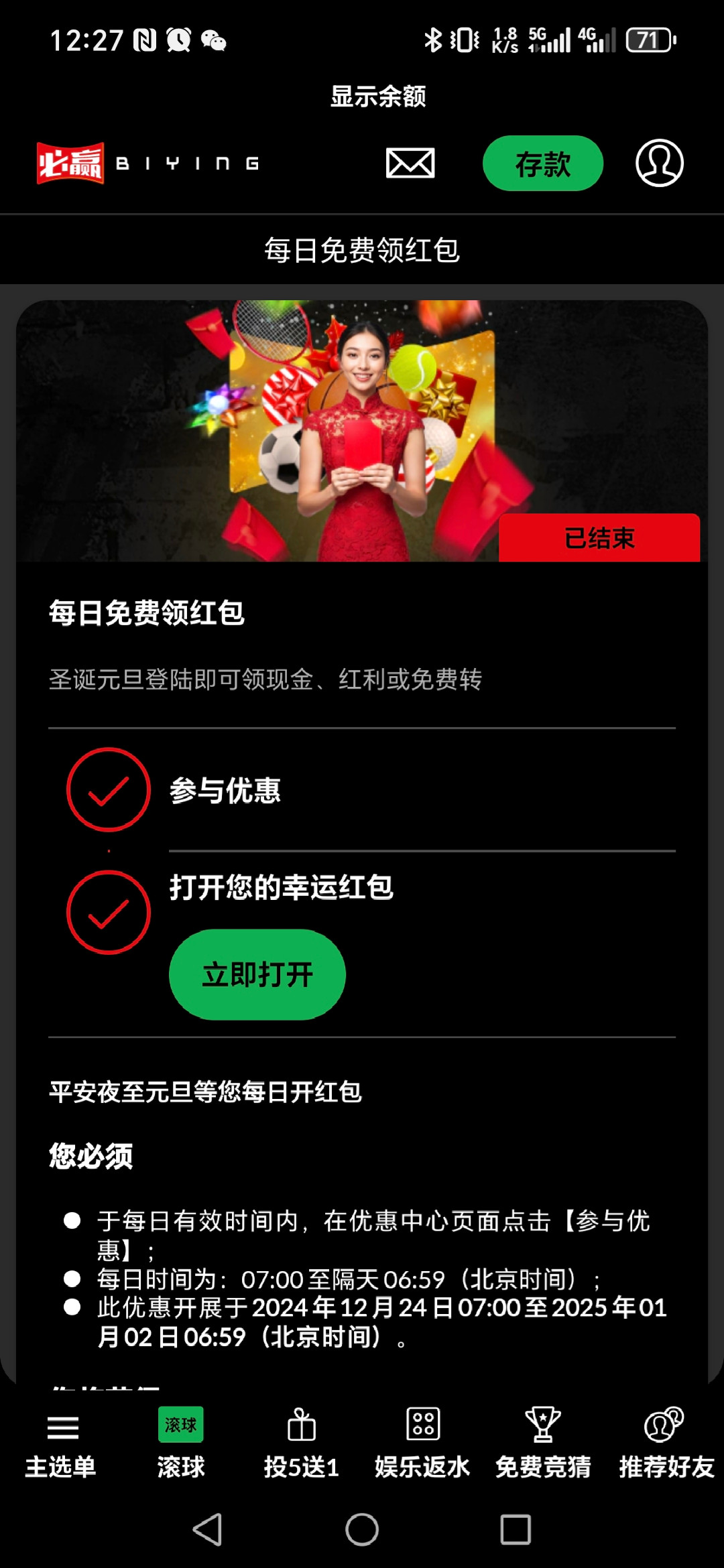 必赢有账号的每天都可以抽奖。(12月24号到1月2号)