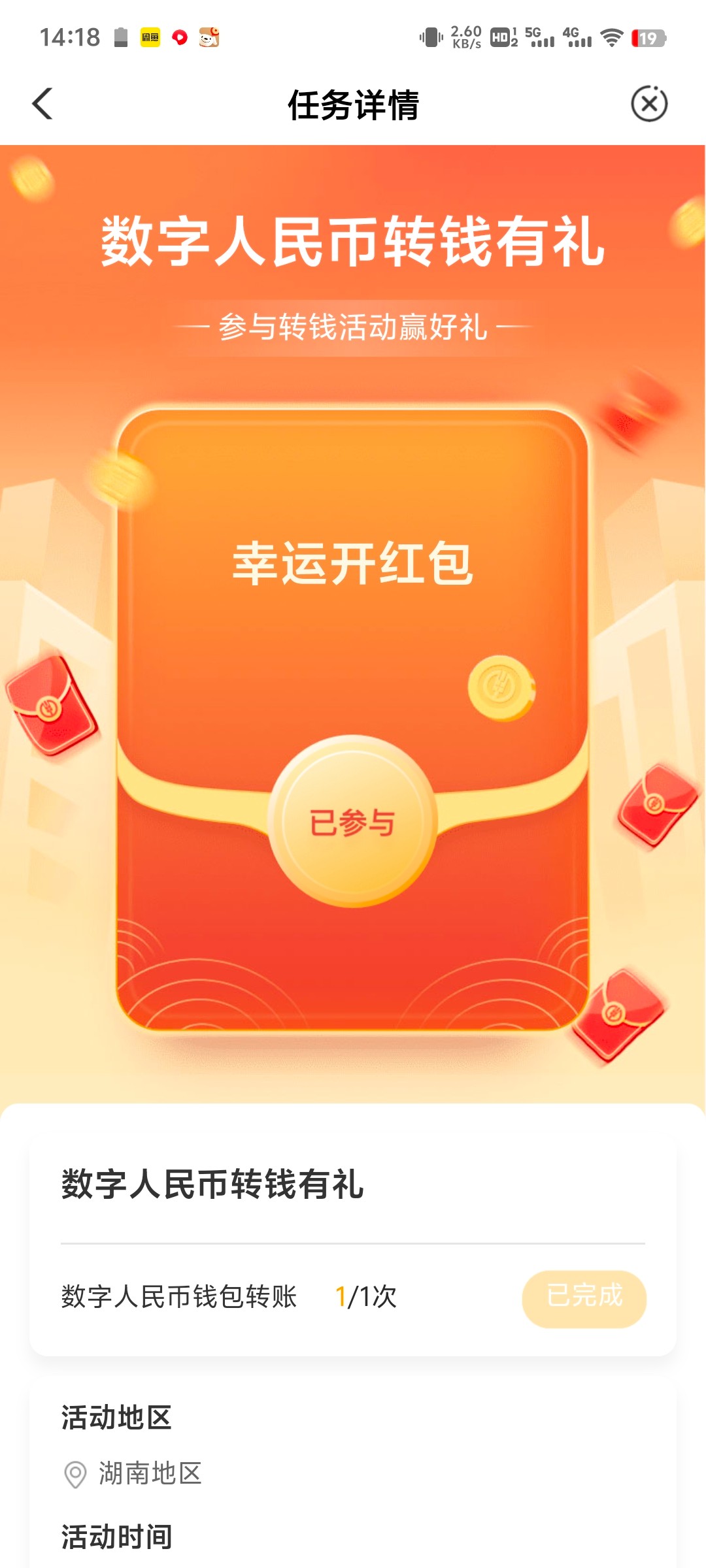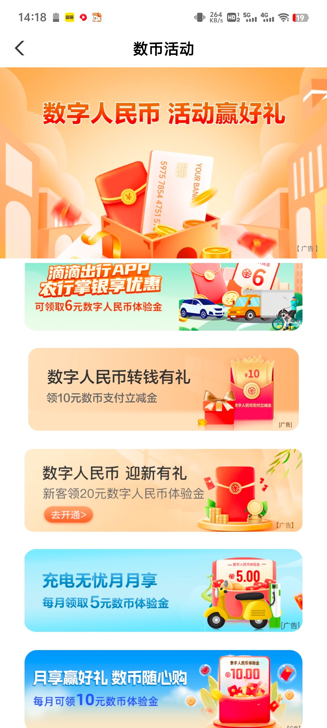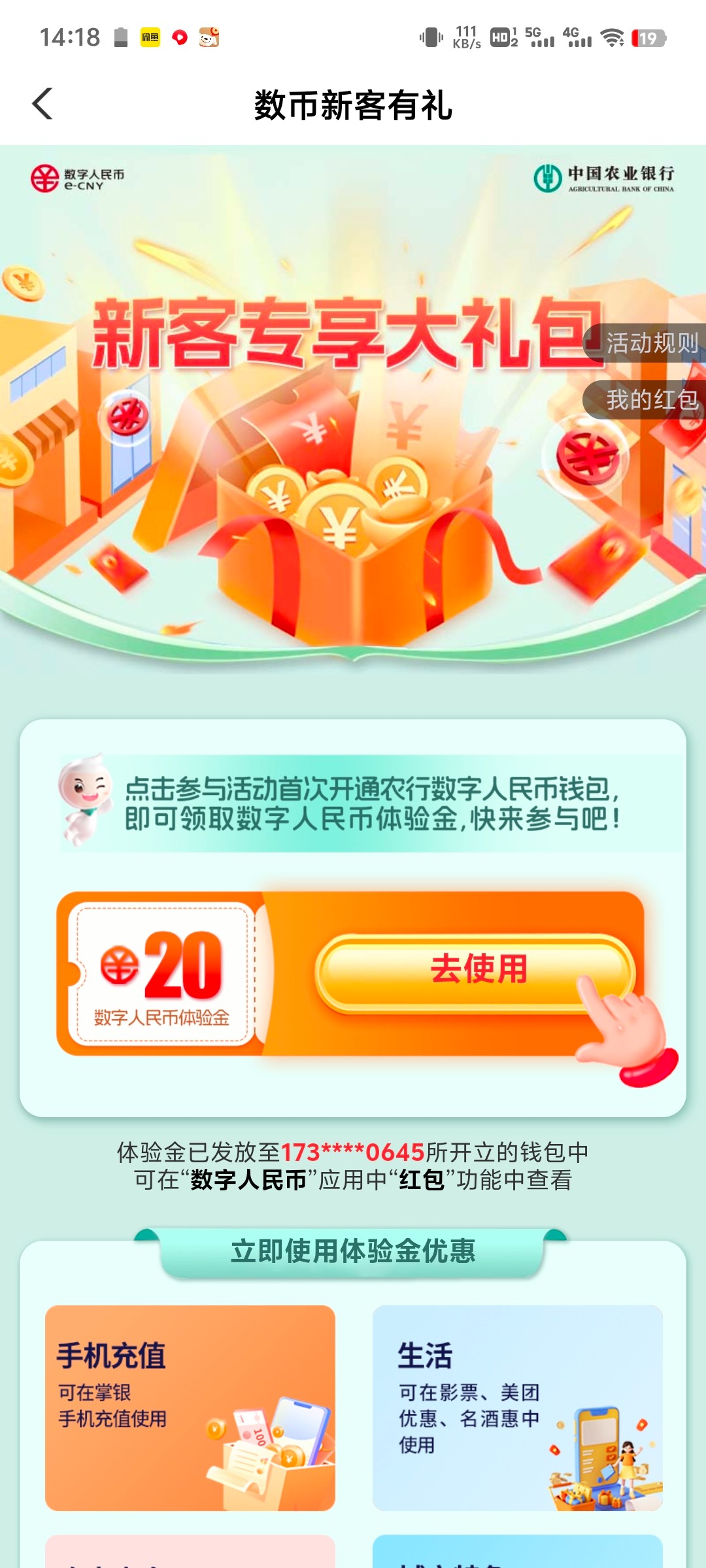 农行首页搜索数字人民币,点开之后点击热门活动,第三个活动是开通钱包直接送20的,然后做完这一个活动返回点开第二个活动,用农行这个钱包随便转一分钱,直接又给10快,可以去首页生活那里,点外卖,充话费啥的,都是自动抵扣的