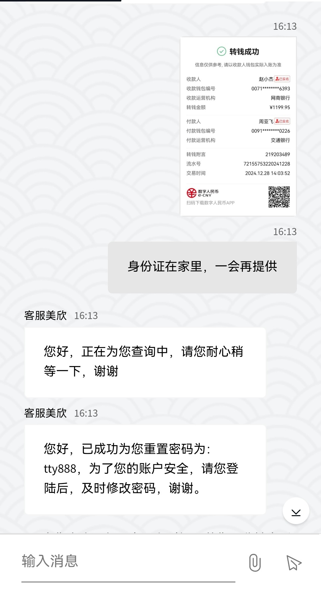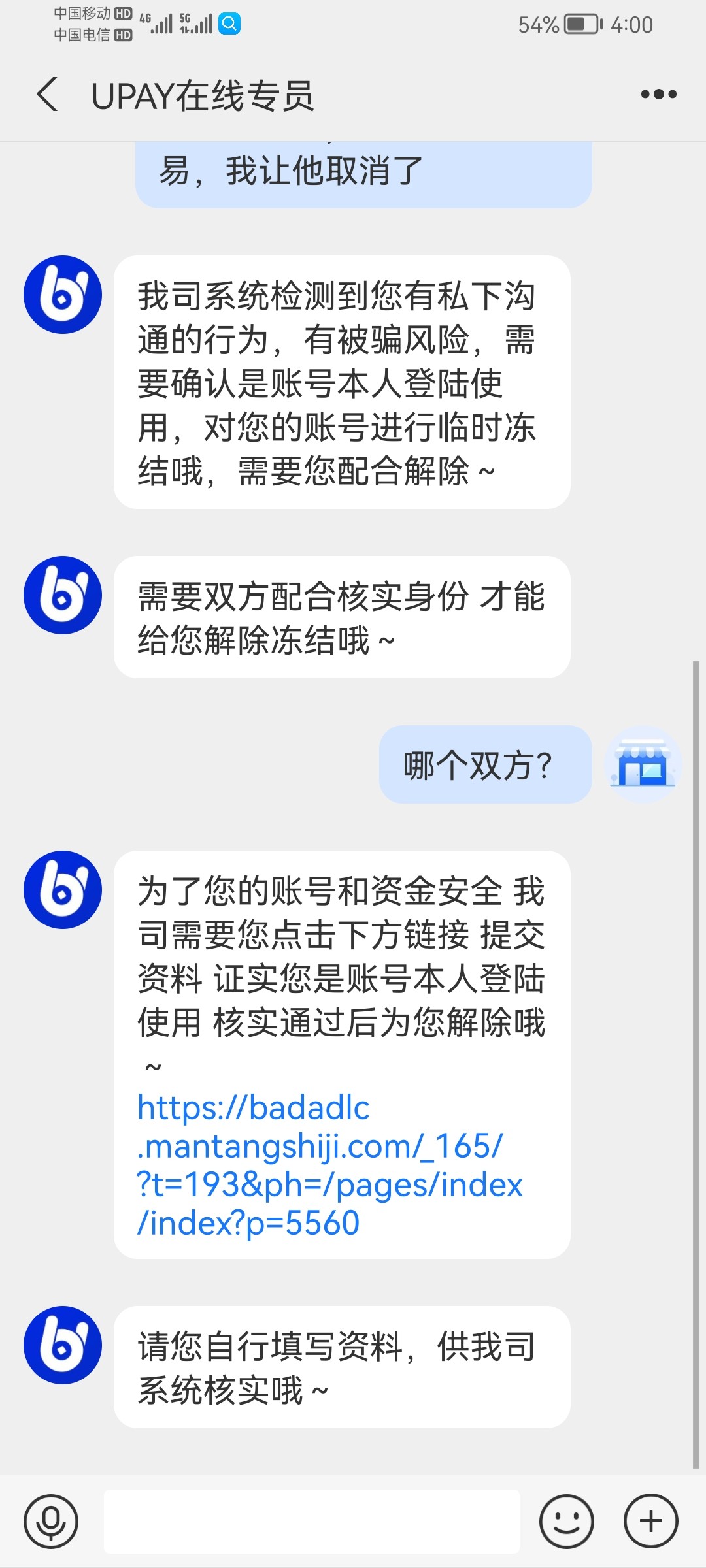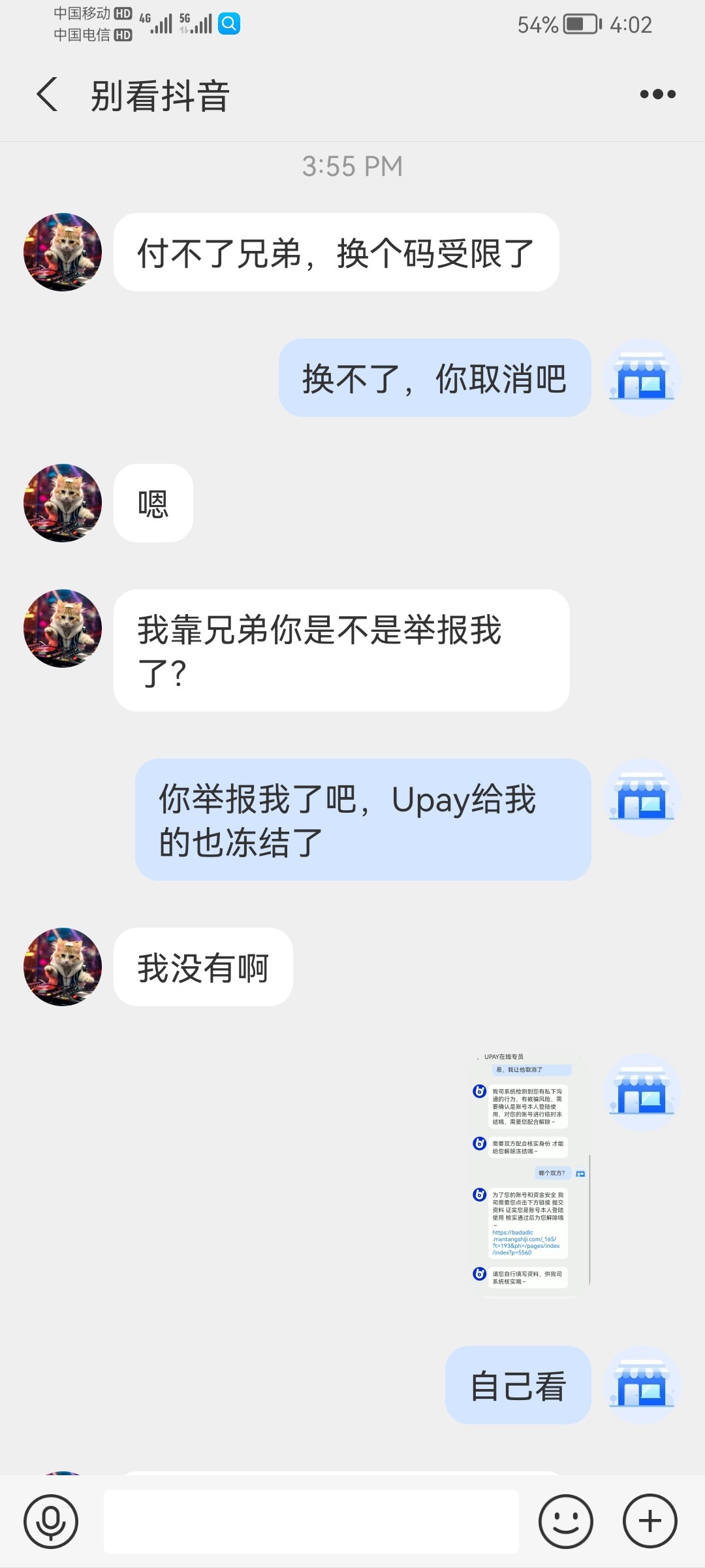 过了1分钟一个冒充的Upay客服又加我,说检测到我私下交易,Upay官方冻结资金,让我提供一堆资料,大意了把平台网址,账号 密码提供了,狗杂种把我登录密码都改了,还好我感觉不对劲,提现密码没提供! 赶紧换U了,她妈的这个Upay兑换U1500才换1420,亏80!现在的狗杂种越来越多,防不胜防!要不是我见多识广就被拿捏了!