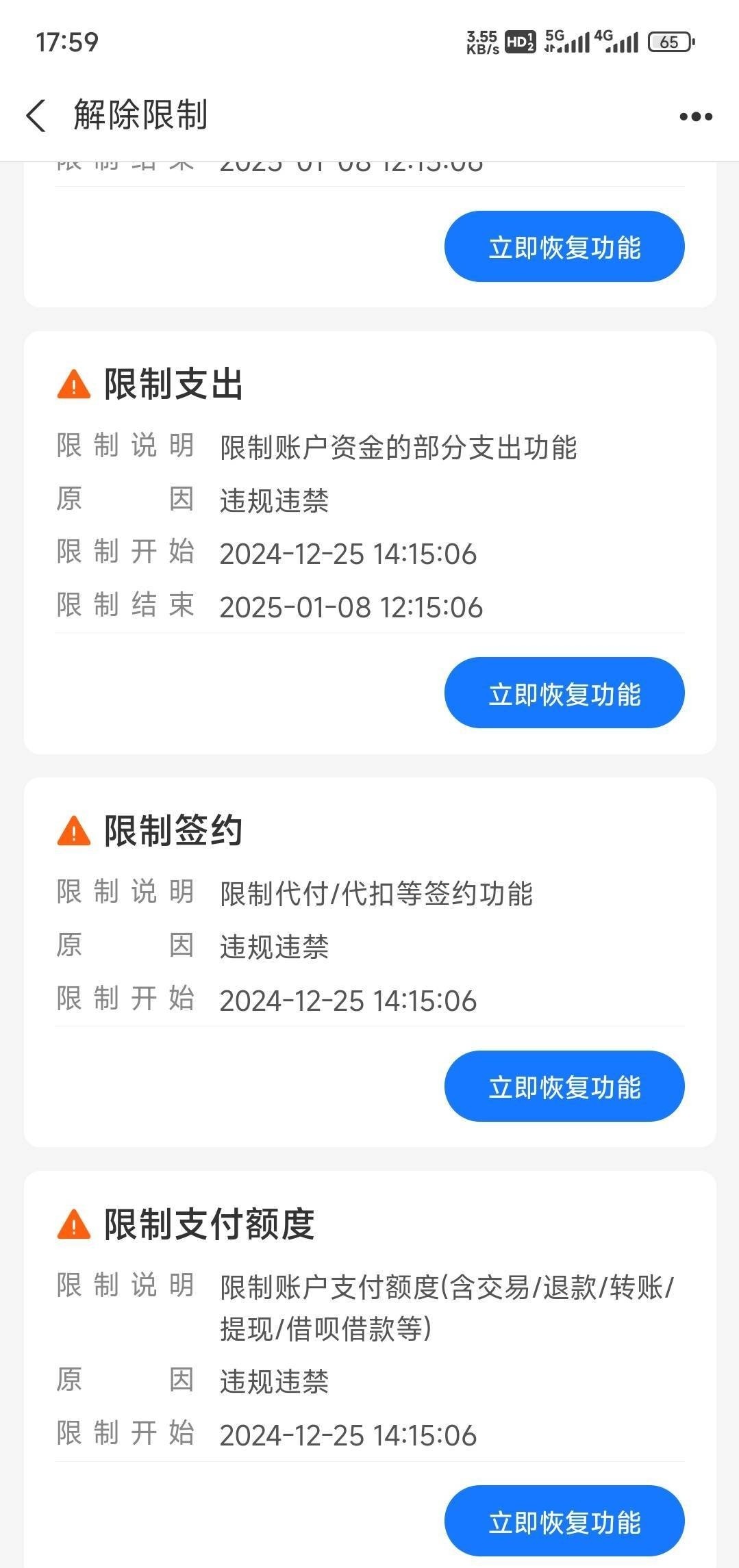 你这种和卡有什么关系,你把违规违禁点出来看一下,什么原因,你这什么用都没有了,全封了,卡司法冻结,干嘛冻结你支付宝?你这个支付宝只有违法才会这样