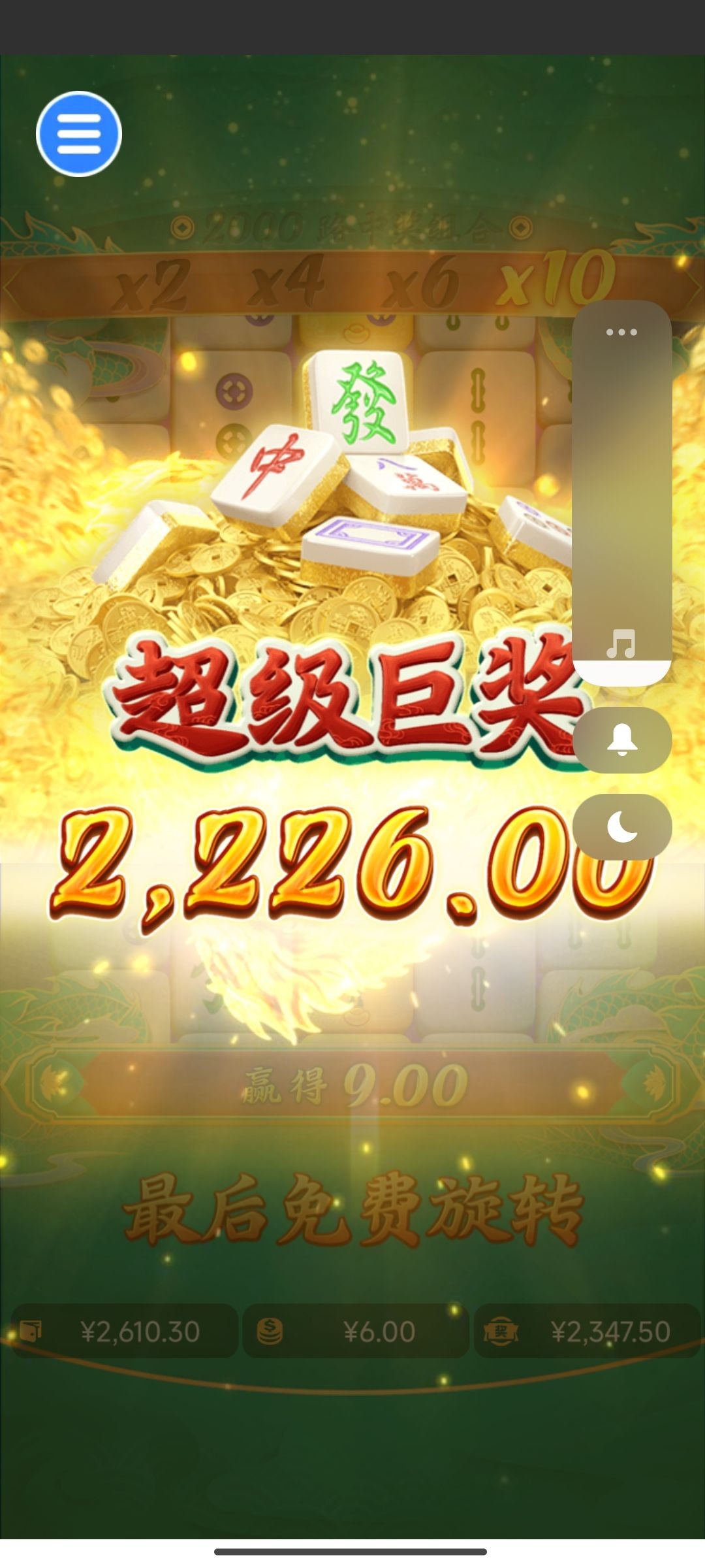 我昨晚麻将来了两次两百多倍,打的2毛。打4毛来胡了,就一下不消。真的服。玩了一年pg,2块的胡从来不超过50倍。