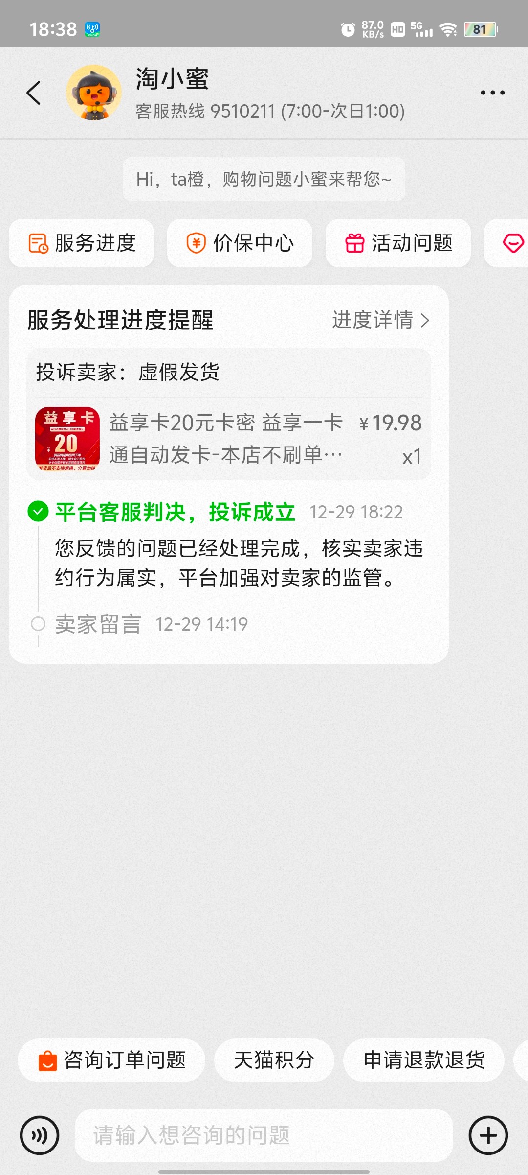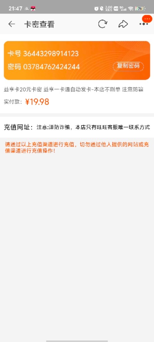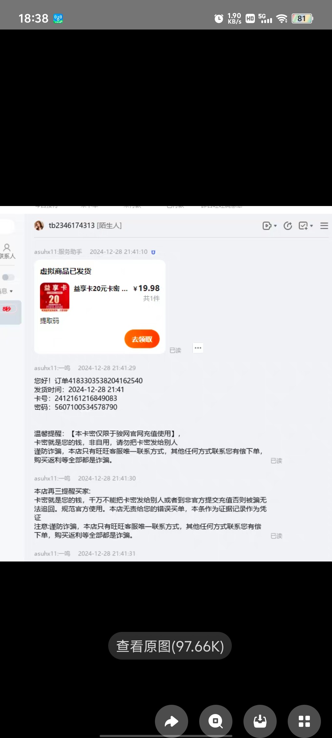益享卡退款, 订单的卡密是无效的,是假的, 只有他后台发过来的是真的, 先把后台的使用了, 然后再去申请退款订单那个卡密不一致 然后让平台介入, 说订单的卡密不一样 就是一直咬着说下单的不一致 无法使用 这个店铺有漏洞