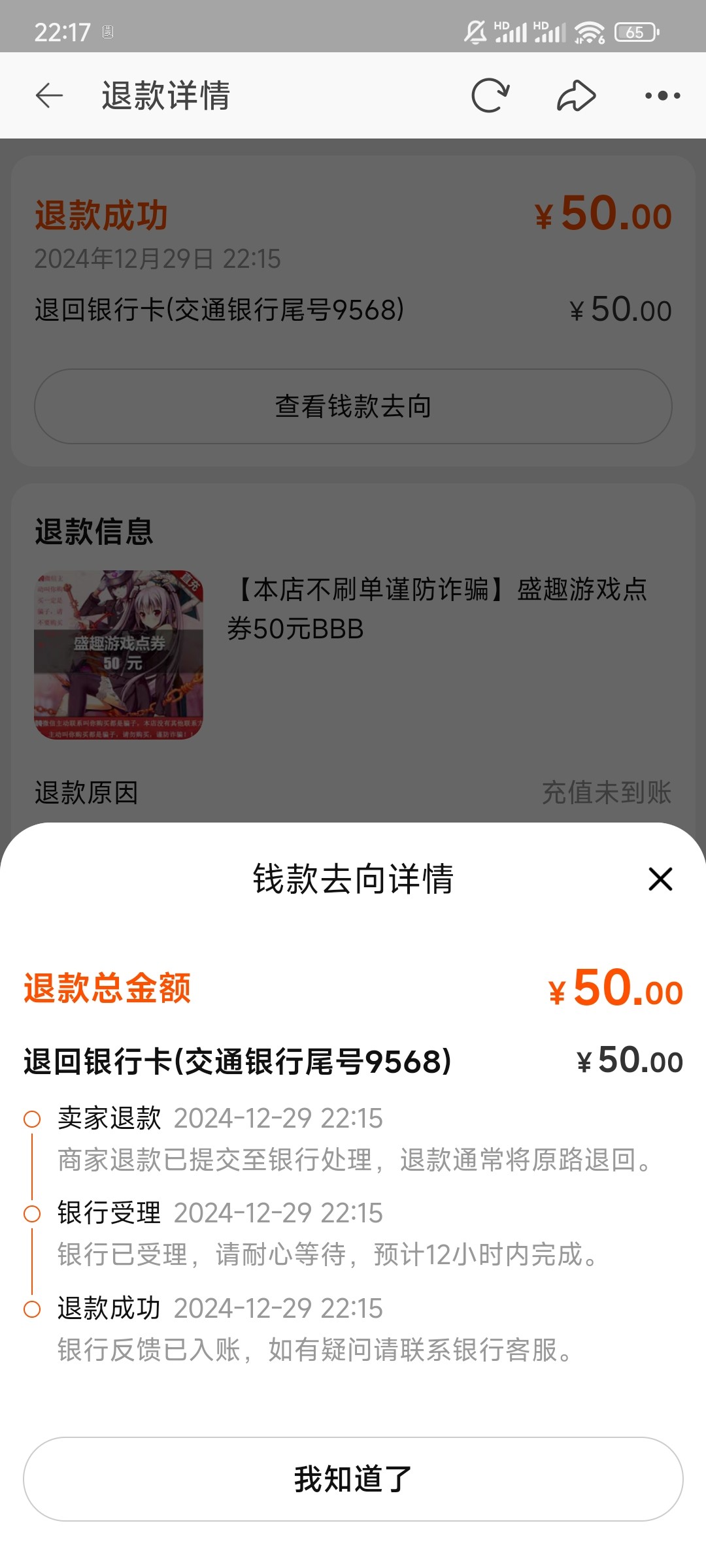 还真退了50,其它还没见退。