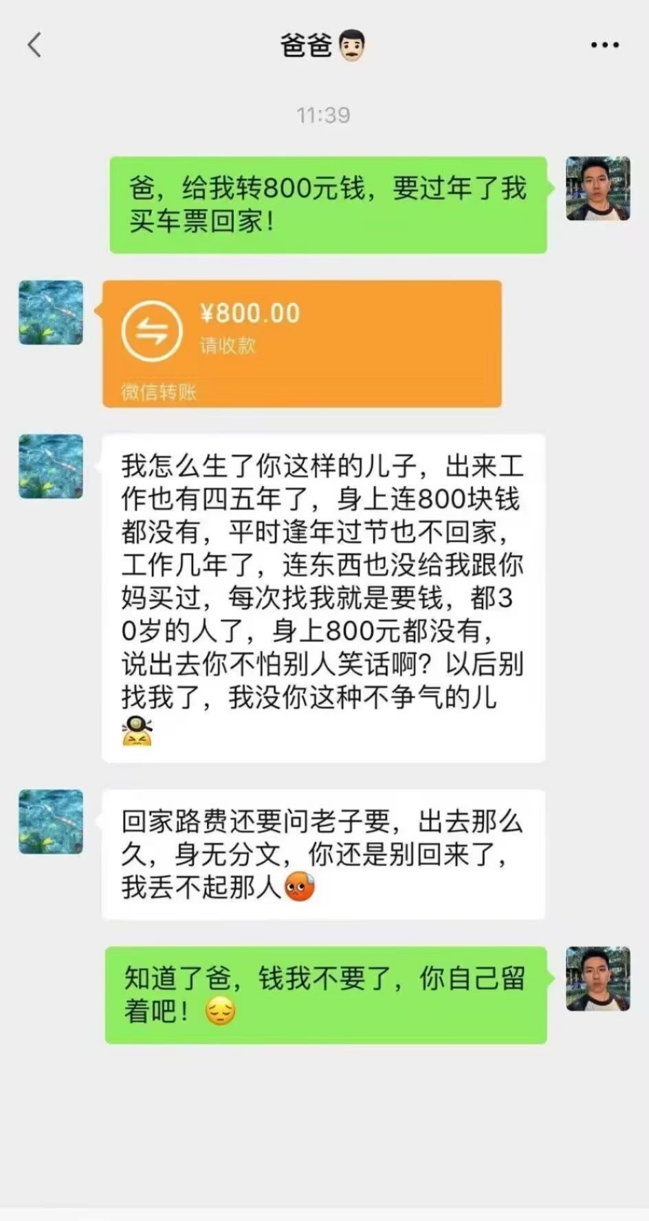 以后别发这种了,父母口气不应该在后面还加表情包 ,还有就是一般就是先训斥 再给你转钱 ,如果没猜错 应该是自导自演的 ……