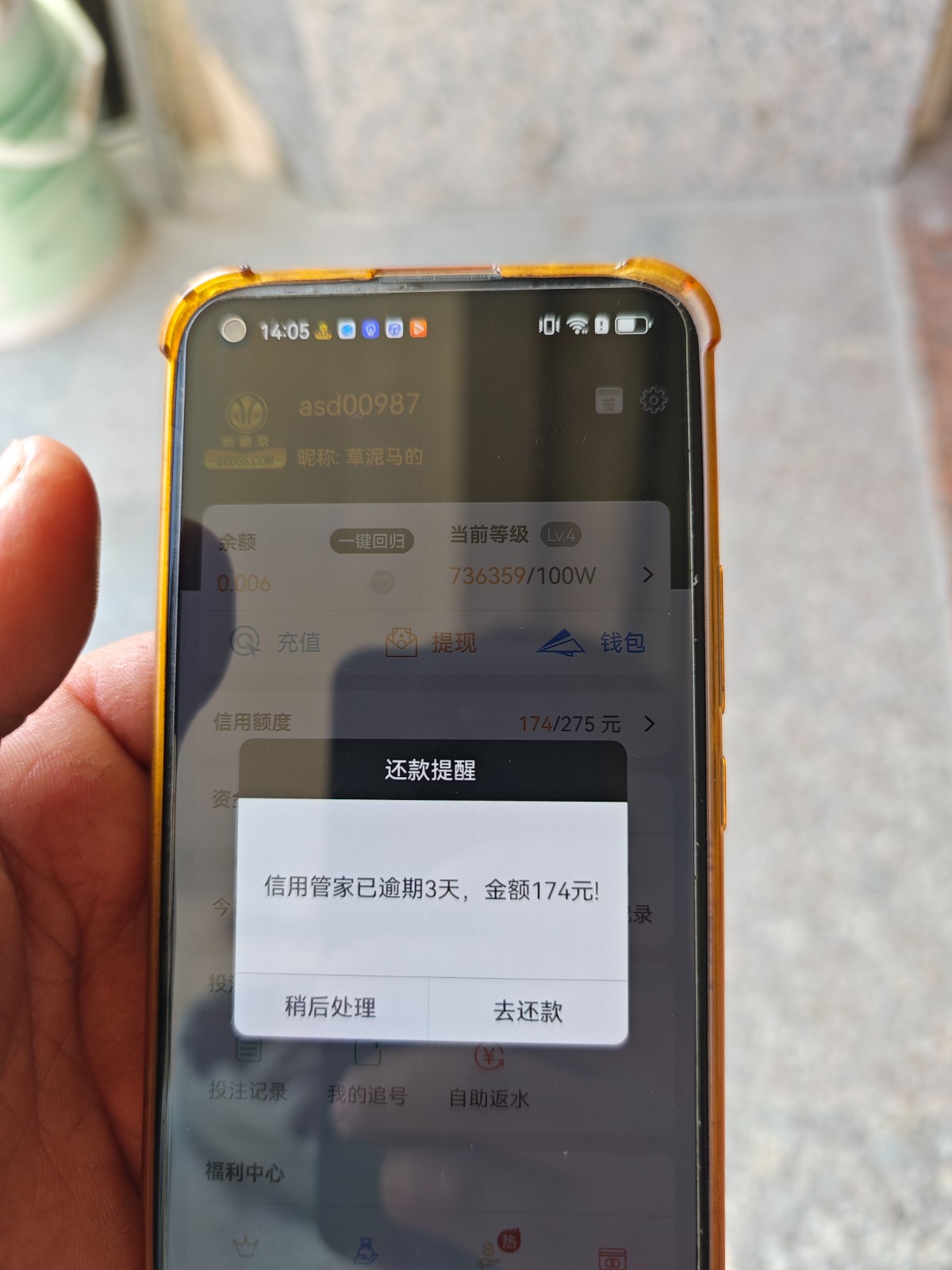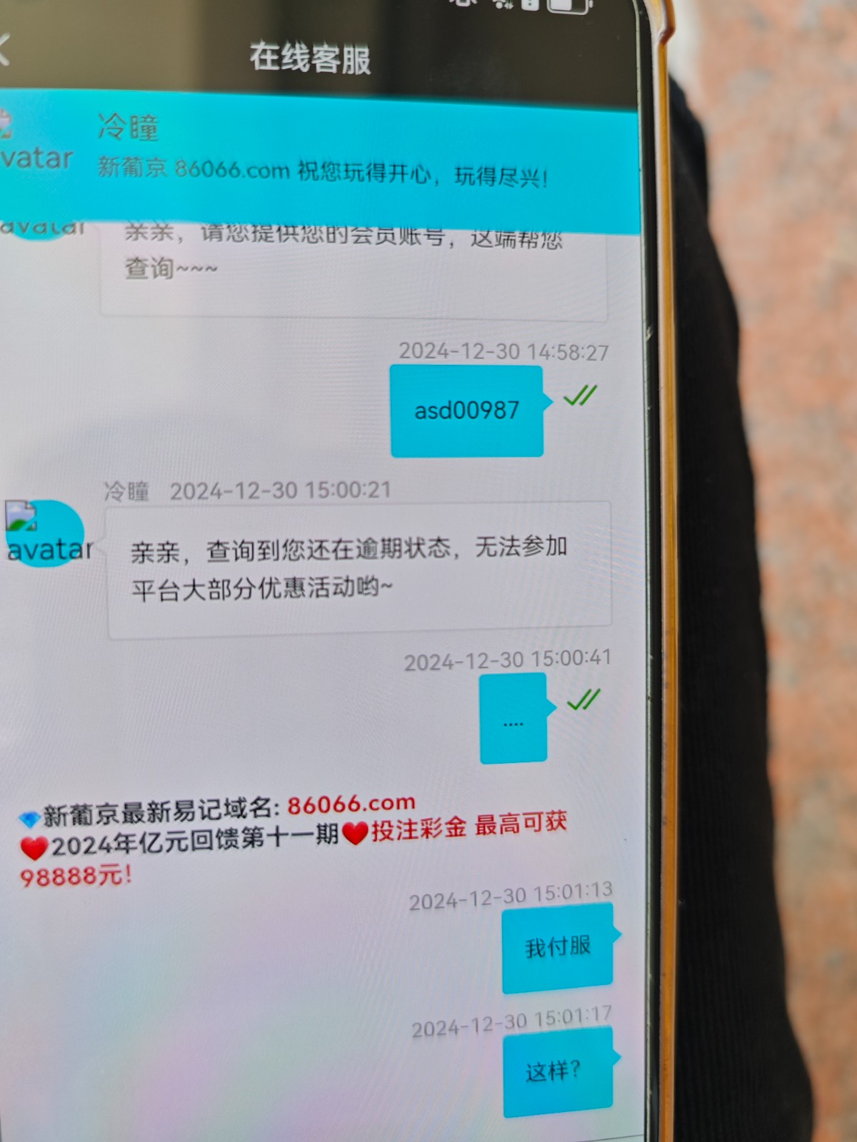 妈的比。860新葡京今天逾期第三天。昨天问客服说要全部还清第二天才能恢复的,现在连超级星期一的彩金都没了。元旦红包开启了都不能抢。优惠都给我停了。现在这样1号我都不知道能不能有那个单笔历史最高回馈,草了。