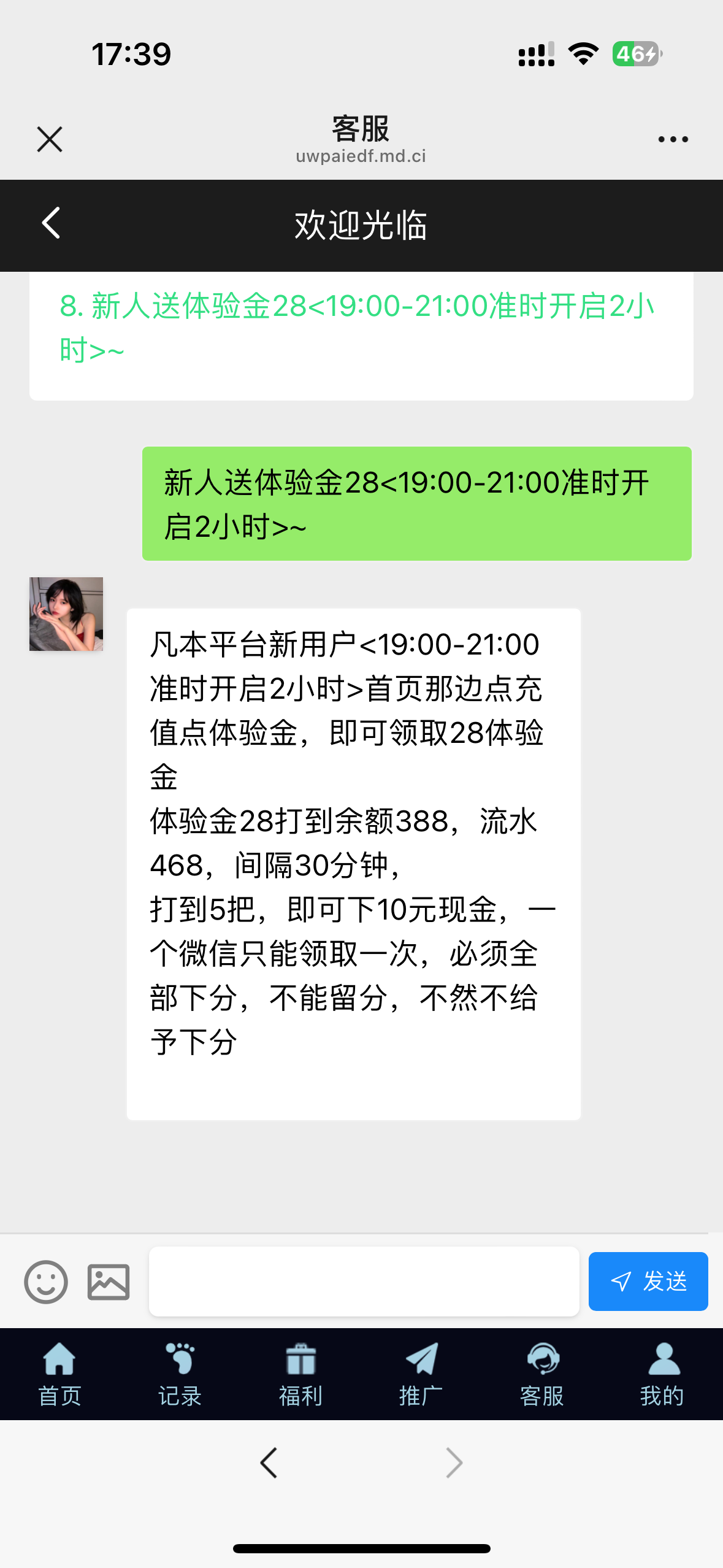 凡本平台新用户<19:00-21:00准时开启2小时>首页那边点充值点体验金,即可领取28体验金