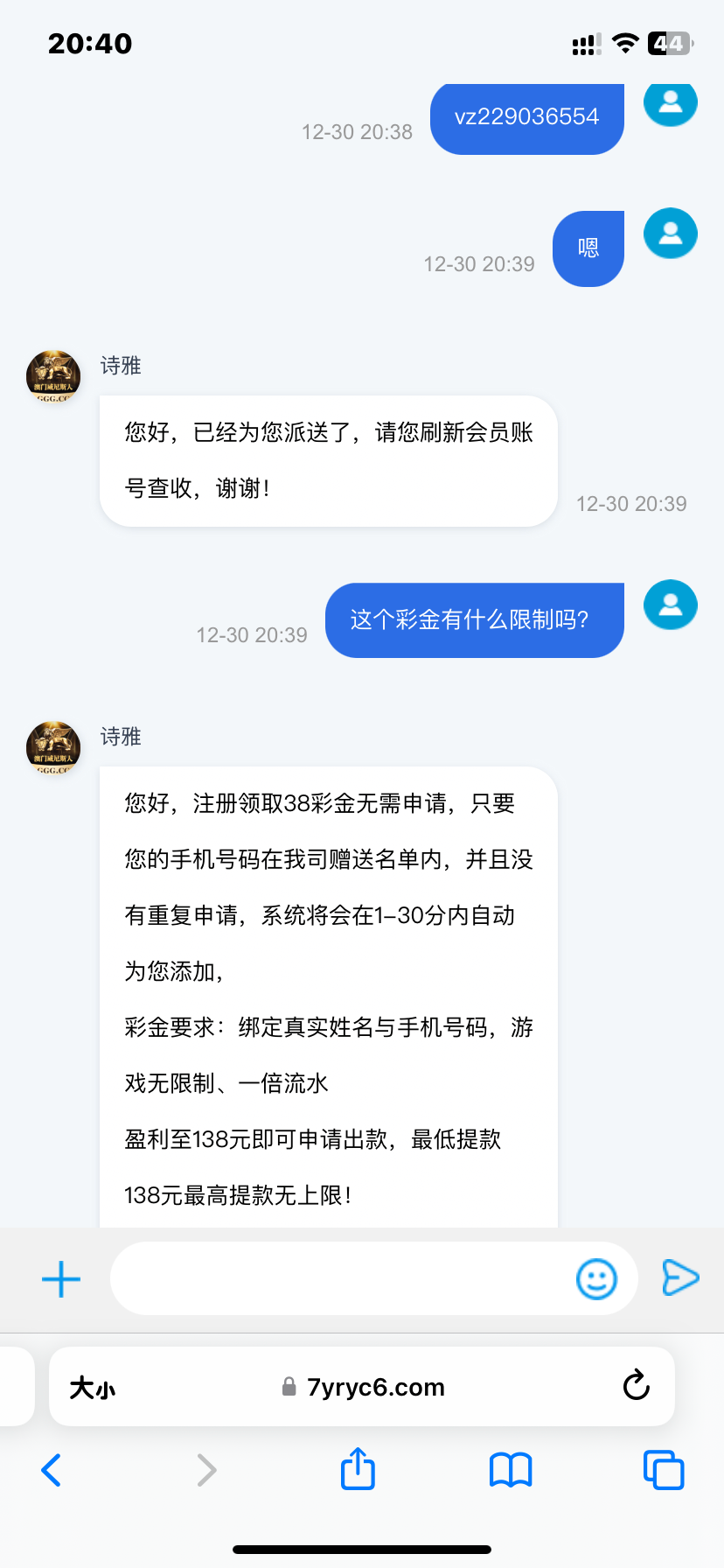 电话彩金12-30 20:57诗雅您好,注册领取38彩金无需申请,只要您的手机号码在我司赠送名单内,并且没有重复申请,系统将会在1-30分内自动为您添加,彩金要求:绑定真实姓名与手机号码,游戏无限制、一倍流水盈利至138元即可申请出款,最低提款138元最高提款无上限!
