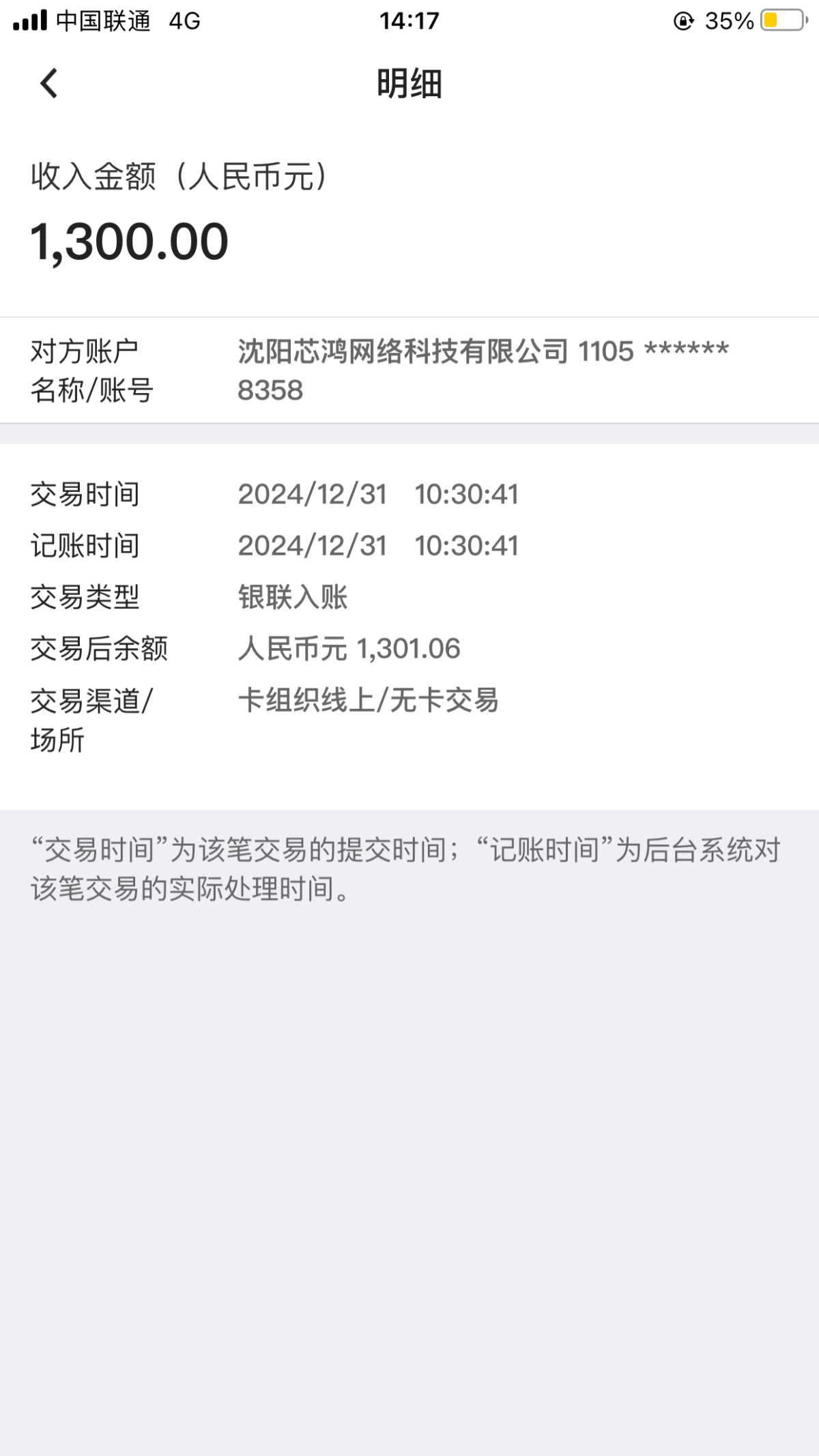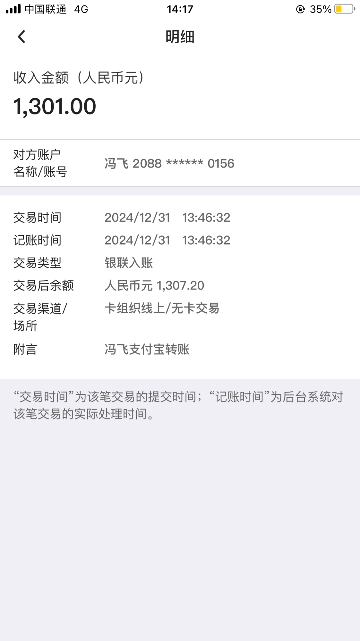 起因是7点多提1301,出款成功没到账,经历近3小时退回提款到账,刚掏出手机又见入账,美滋滋,白得1300