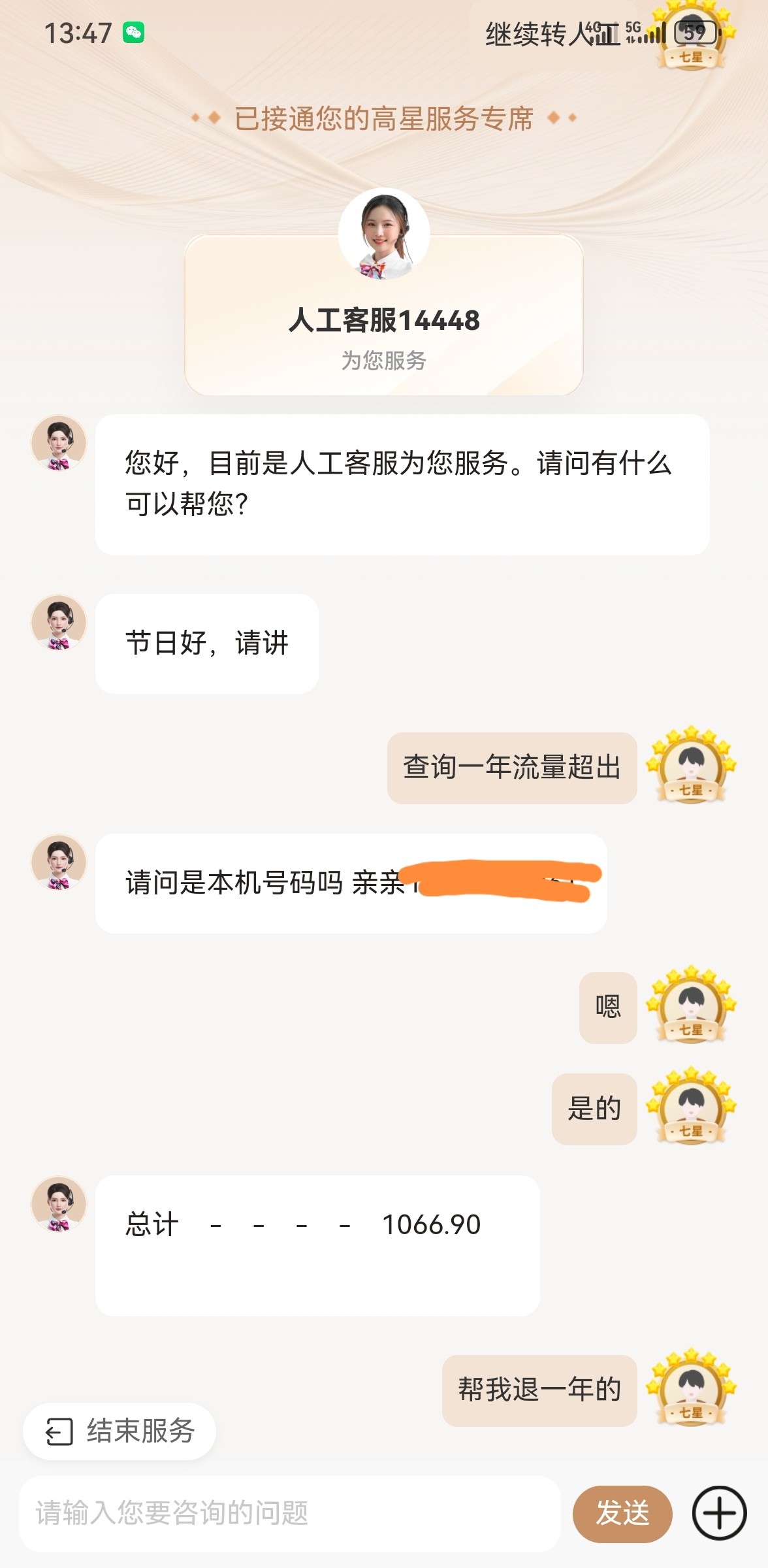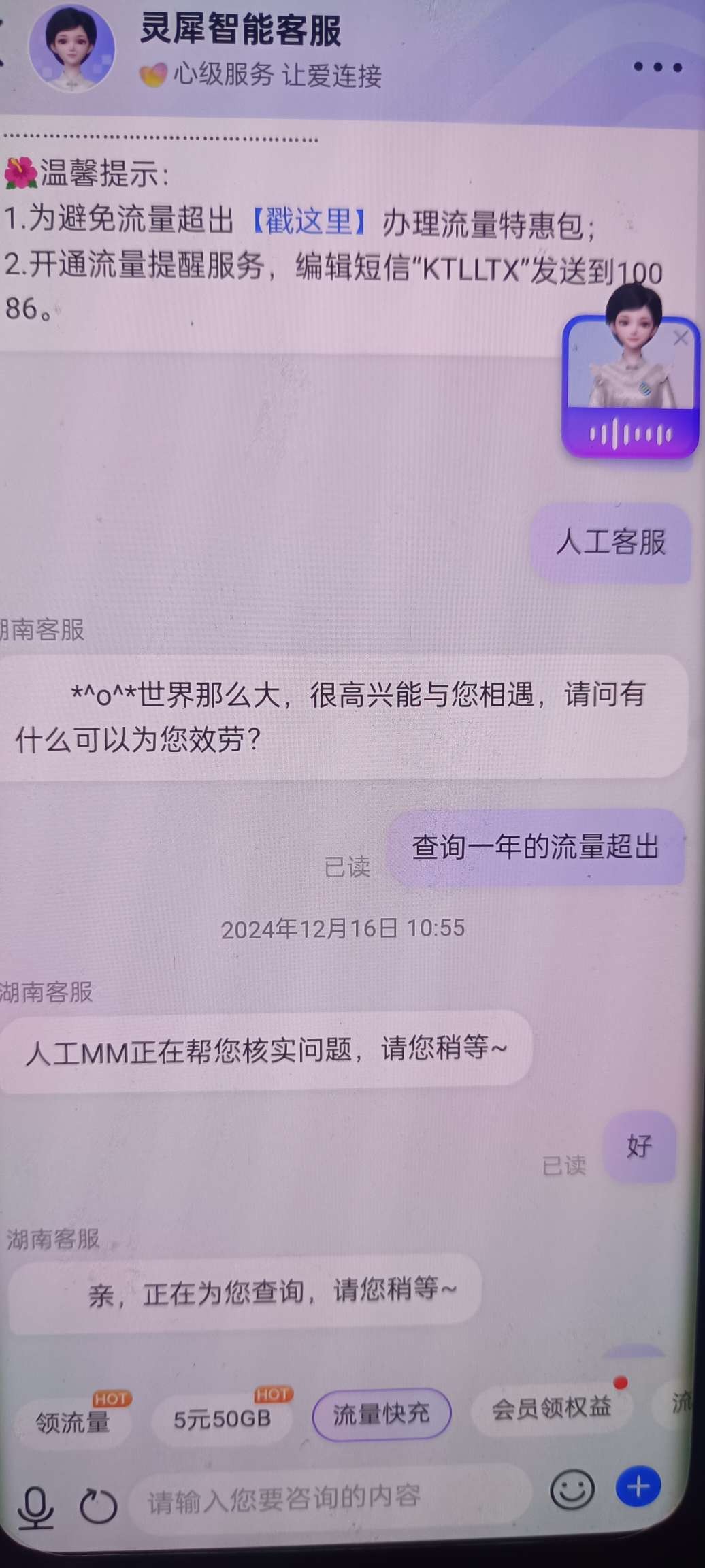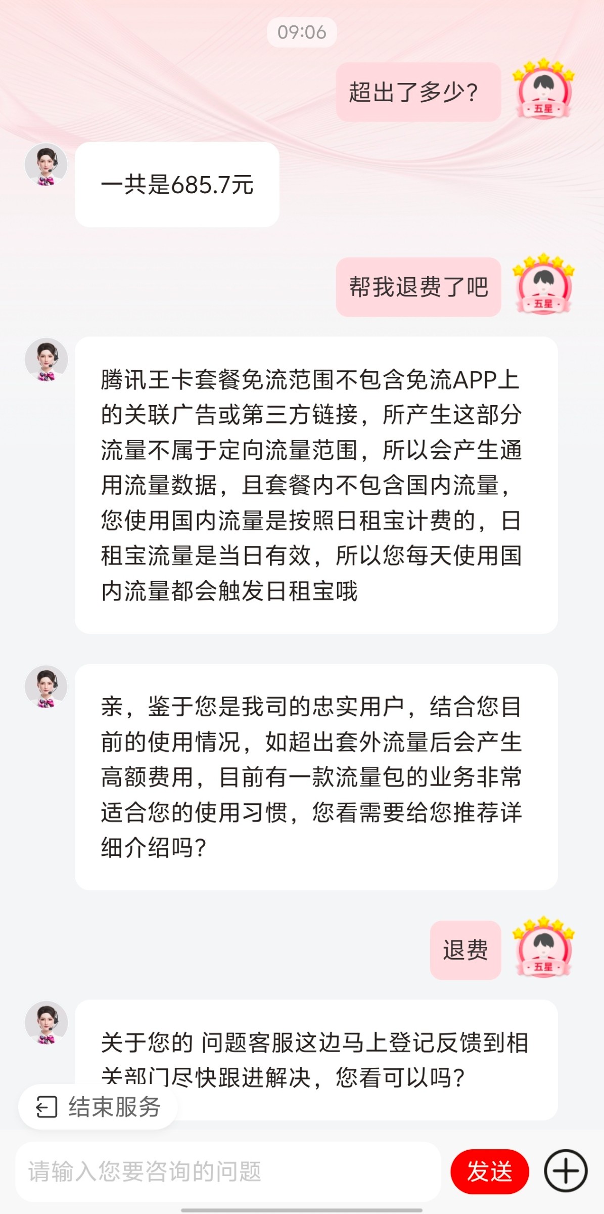 步骤-3没有自动查询就转人工,查询完了有流量超出扣费的话 回复【退费】就会到账的哦