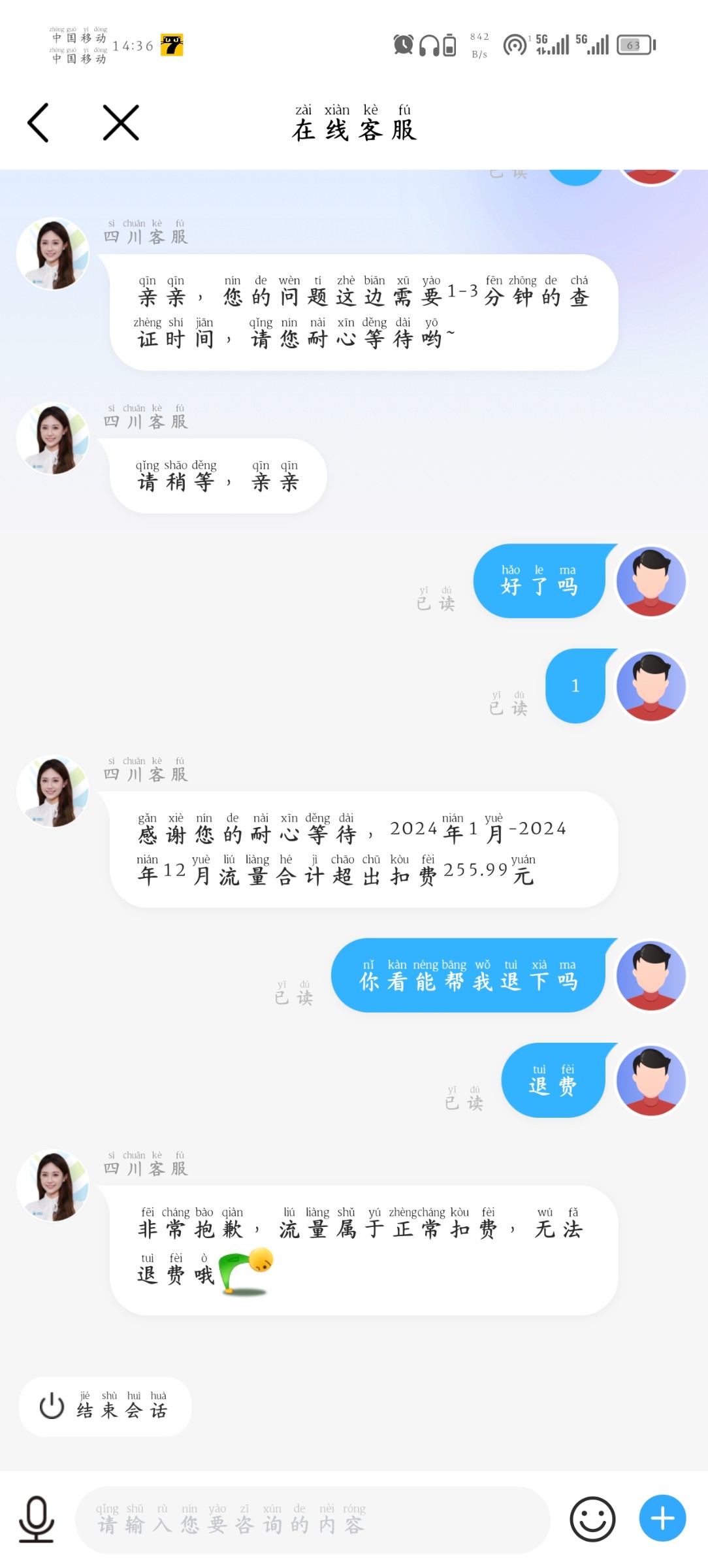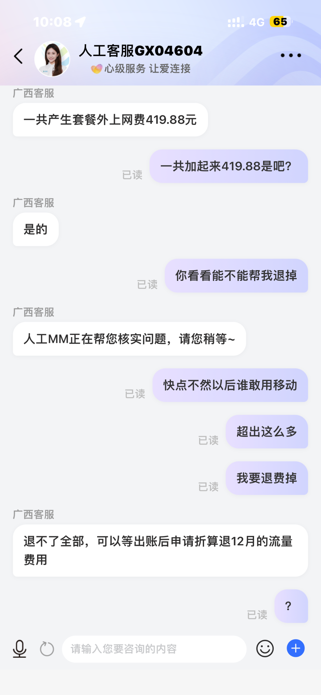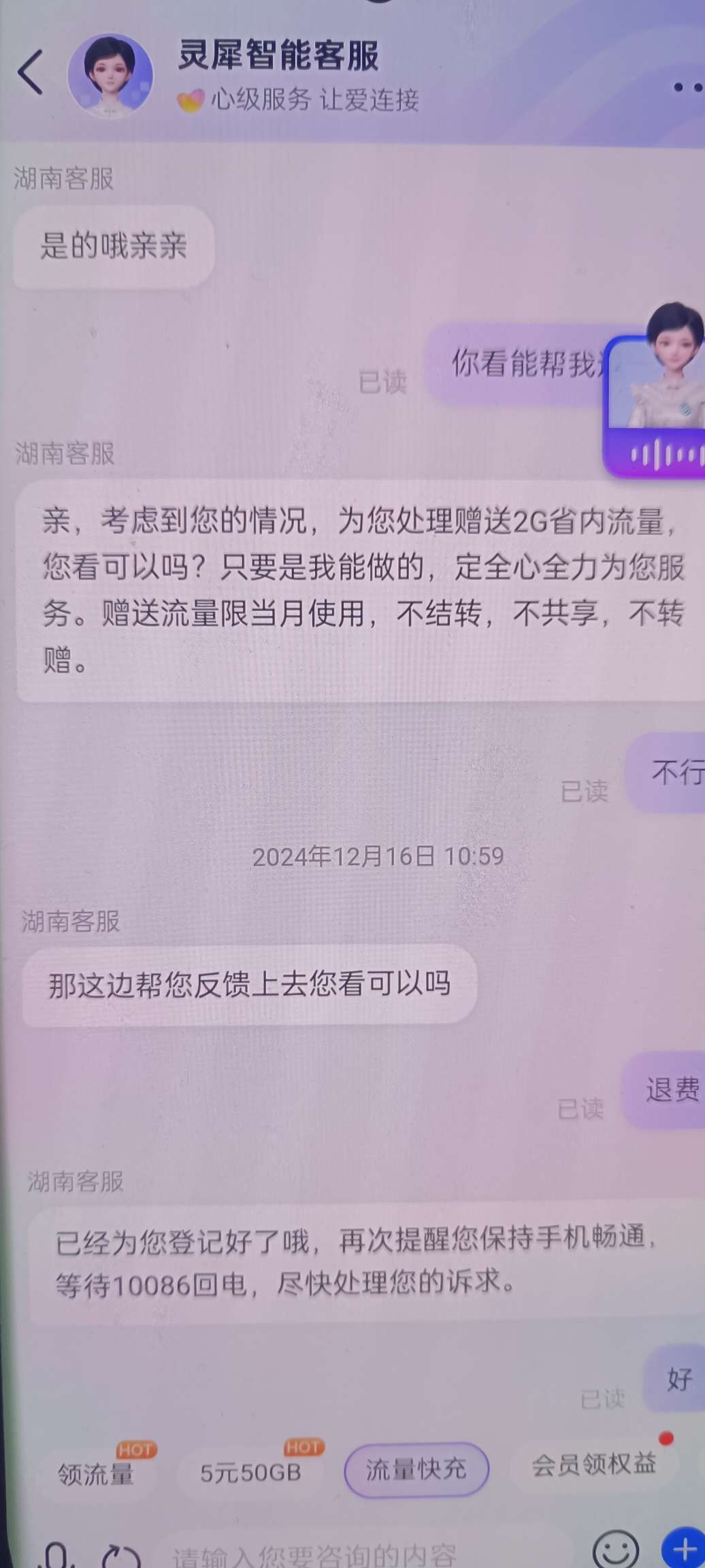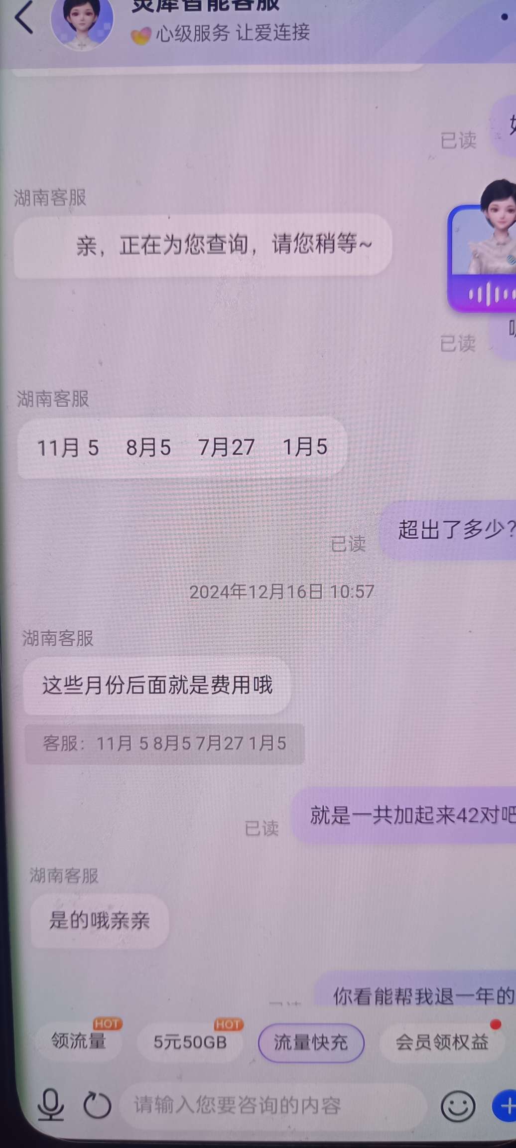 步骤-3没有自动查询就转人工,查询完了有流量超出扣费的话 回复【退费】就会到账的哦